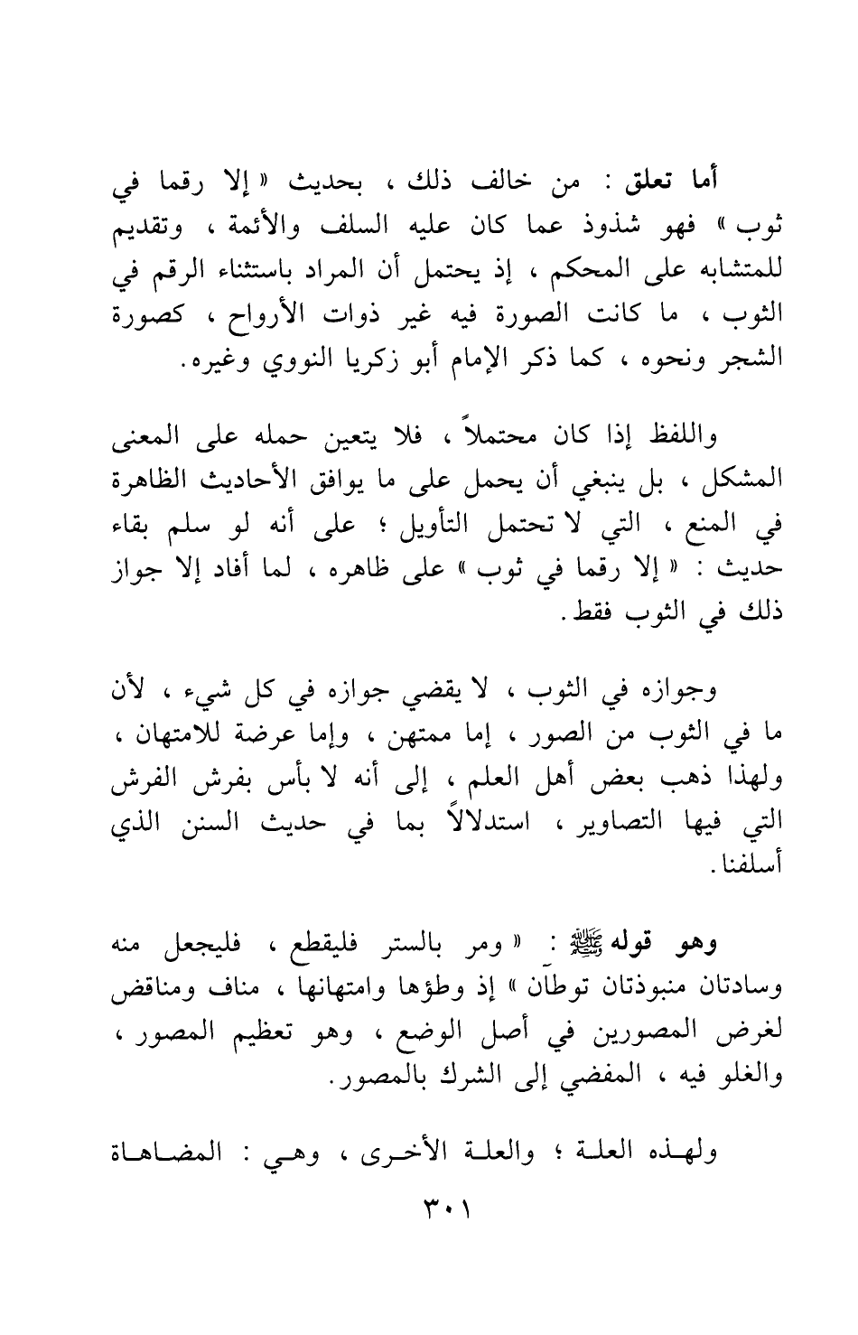 أما تعلق من خالف ذلك بحديث: "إلا رقما في ثوب" 1، فهو شذوذ عما كان عليه السلف والأئمة، وتقديم للمتشابه على المحكم؛ إذ يحتمل أن المراد باستثناء الرقم في الثوب، ما كانت الصورة فيه غير ذوات الأرواح، كصورة الشجر ونحوه، كما ذكر الإمام أبو زكريا النووي وغيره.