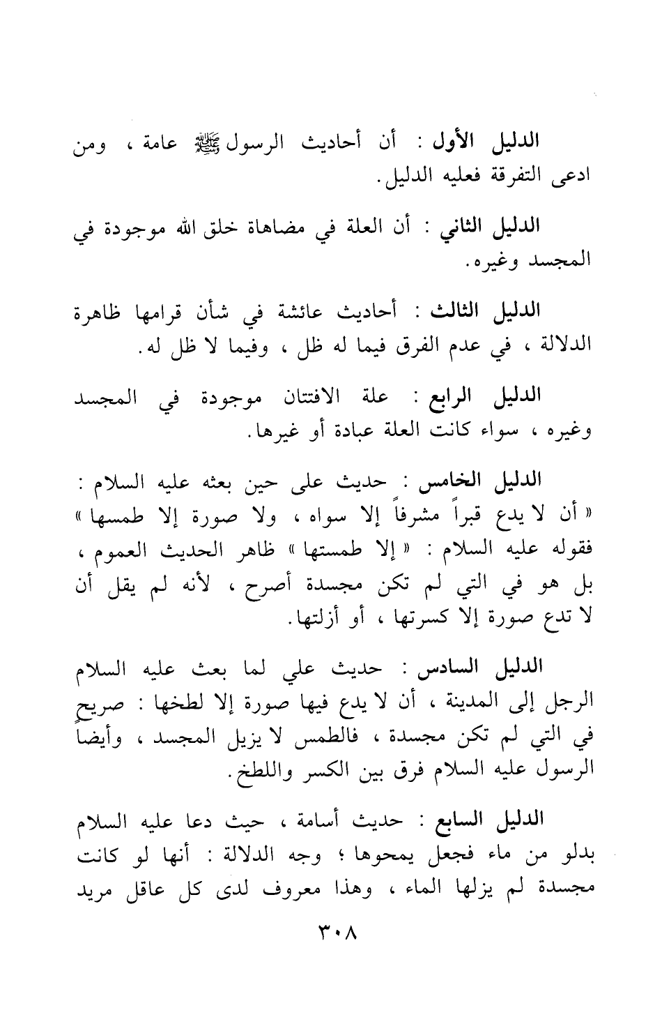 الدليل الخامس: حديث علي حين بعثه عليه السلام: "أن لا يدع قبرا مشرفا إلا سواه، ولا صورة إلا طمسها" 1، فقوله عليه السلام: (إلا طمستها) ظاهر الحديث العموم، بل هو في التي لم تكن مجسدة أصرح، لأنه لم يقل أن لا تدع صورة إلا كسرتها، أو أزلتها.