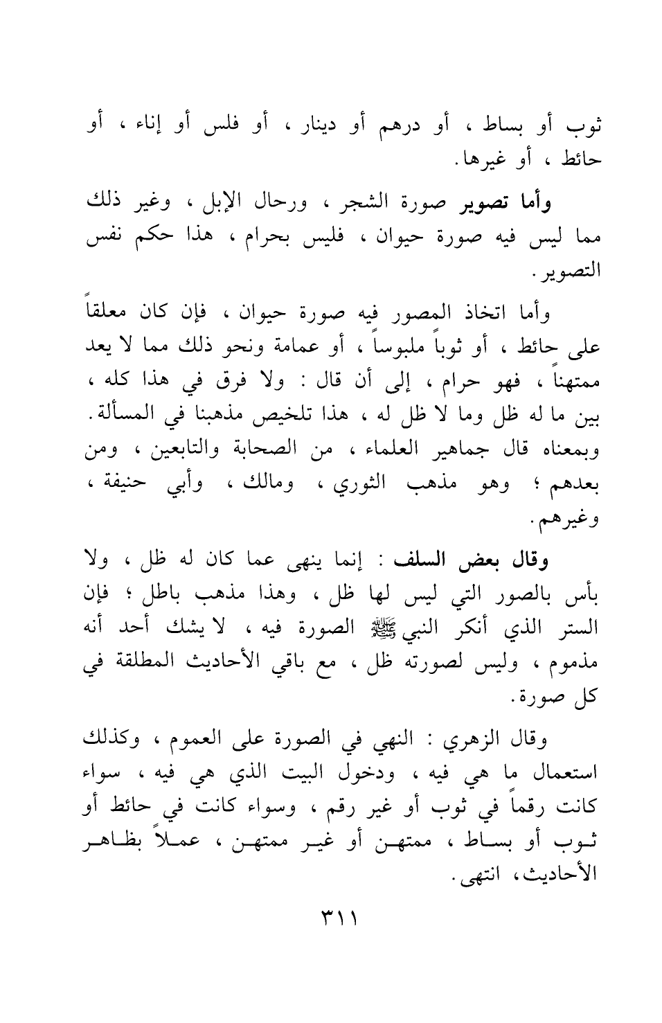 وأما اتخاذ المصور فيه صورة حيوان، فإن كان معلقا على حائط، أو ثوبا ملبوسا، أو عمامة ونحو ذلك مما لا يعد ممتهنا، فهو حرام، إلى أن قال: ولا فرق في هذا كله، بين ما له ظل وما لا ظل له، هذا تلخيص مذهبنا في المسألة. وبمعناه قال جماهير العلماء، من الصحابة والتابعين ومن بعدهم; وهو مذهب الثوري، ومالك، وأبي حنيفة، وغيرهم.