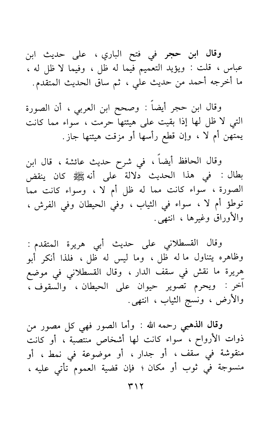 وقال الحافظ أيضا، في شرح حديث عائشة: قال ابن بطال: في هذا الحديث دلالة على أنه صلى الله عليه وسلم كان ينقض الصورة، سواء كانت مما له ظل أم لا، وسواء كانت مما توطأ أم لا، سواء في الثياب، وفي الحيطان وفي الفرش، والأوراق وغيرها. انتهى.