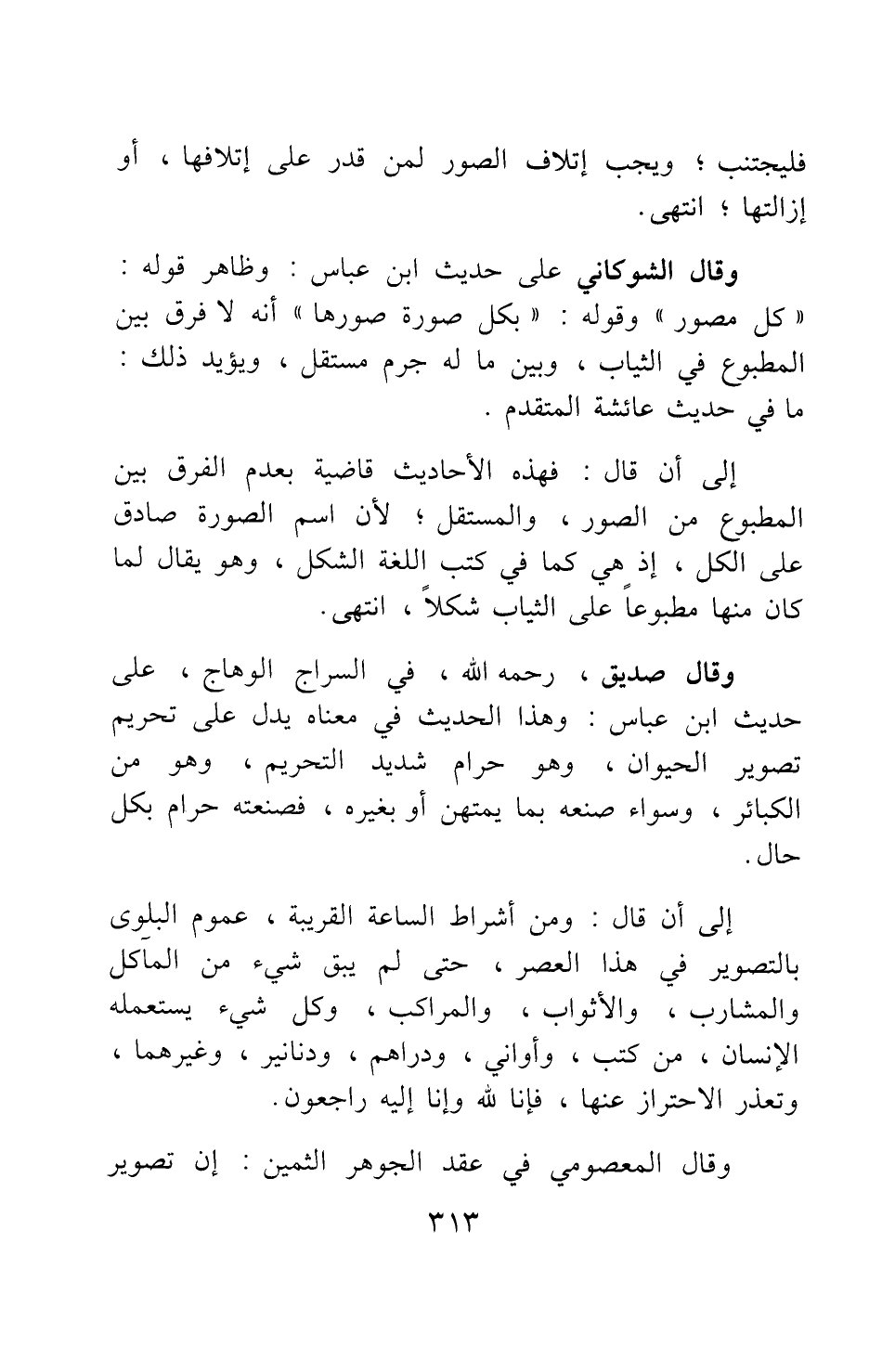 إلى أن قال: ومن أشراط الساعة القريبة، عموم البلوى بالتصوير في هذا العصر، حتى لم يبق شيء من المآكل والمشارب، والأثواب، والمراكب، وكل شيء يستعمله الإنسان، من كتب، وأواني، ودراهم، ودنانير، وغيرها، وتعذر الاحتراز عنها، فإنا لله وإنا إليه راجعون.