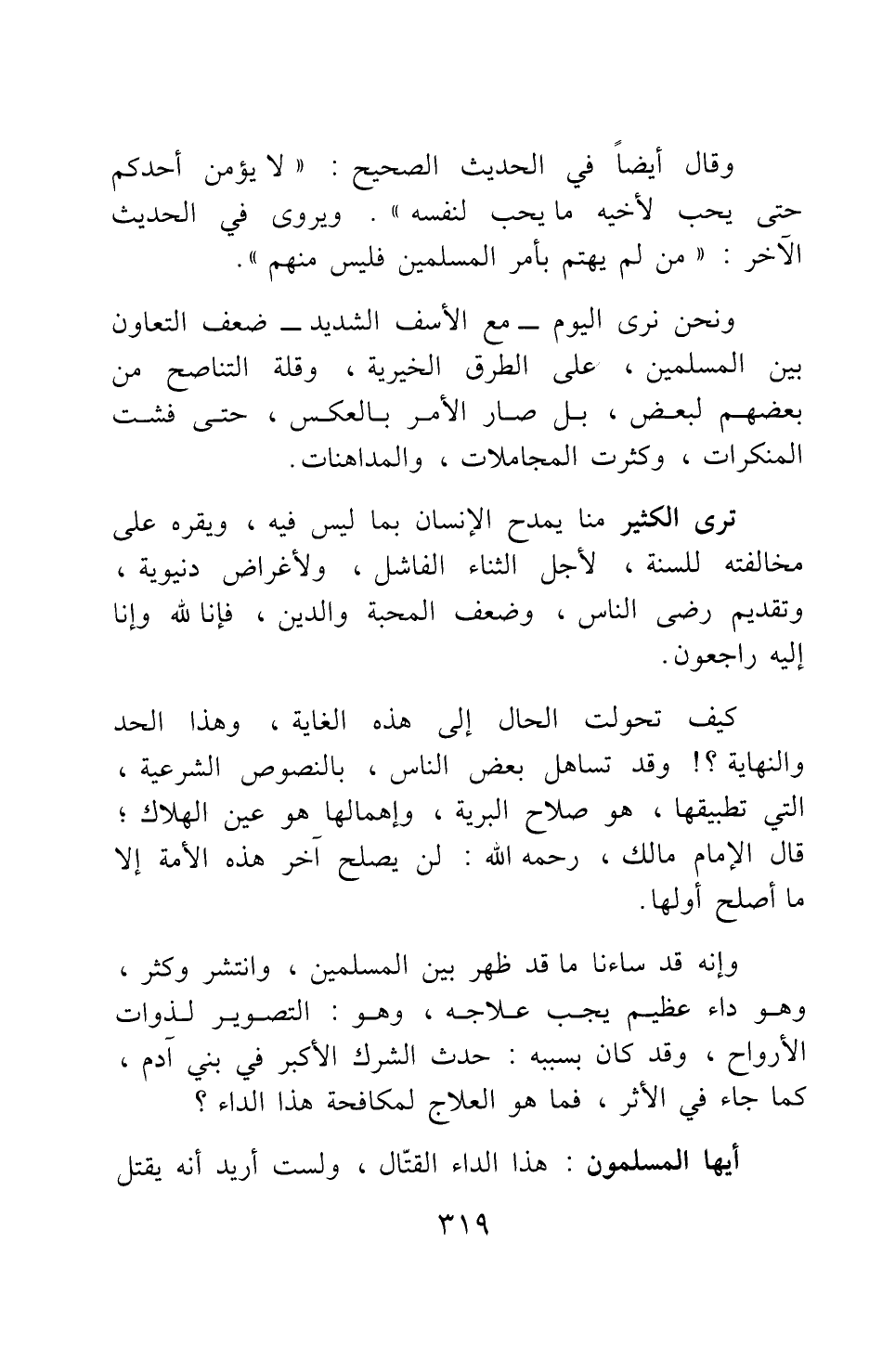 وقال أيضا في الحديث الصحيح: "لا يؤمن أحدكم حتى يحب لأخيه ما يحب لنفسه" 1، ويروى في الحديث الآخر: "من لم يهتم بأمر المسلمين فليس منهم".