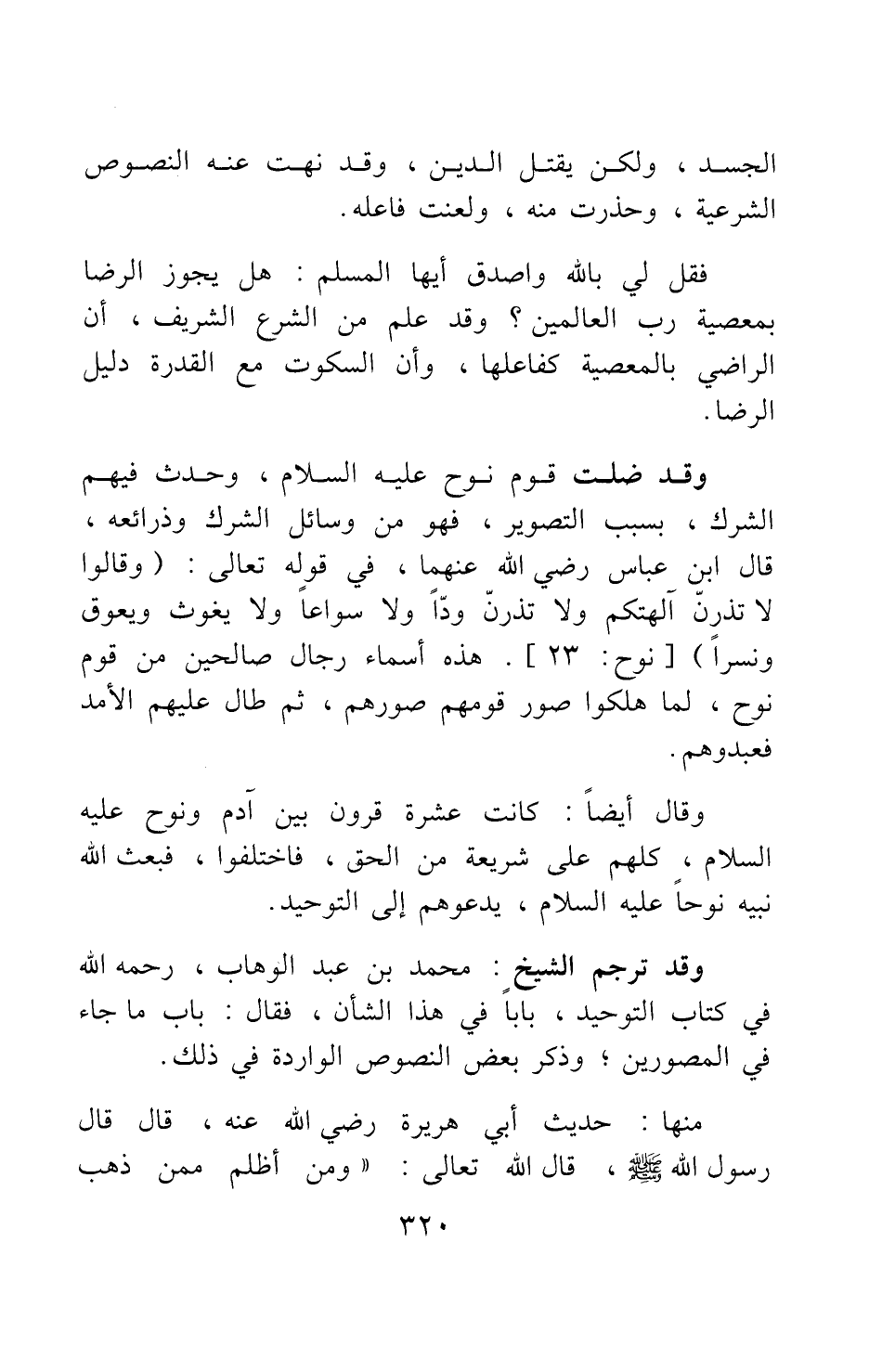 وقال أيضا: (كانت عشرة قرون بين آدم ونوح عليه السلام، كلهم على شريعة من الحق، فاختلفوا، فبعث الله نبيه نوحا عليه السلام، يدعوهم إلى التوحيد) .