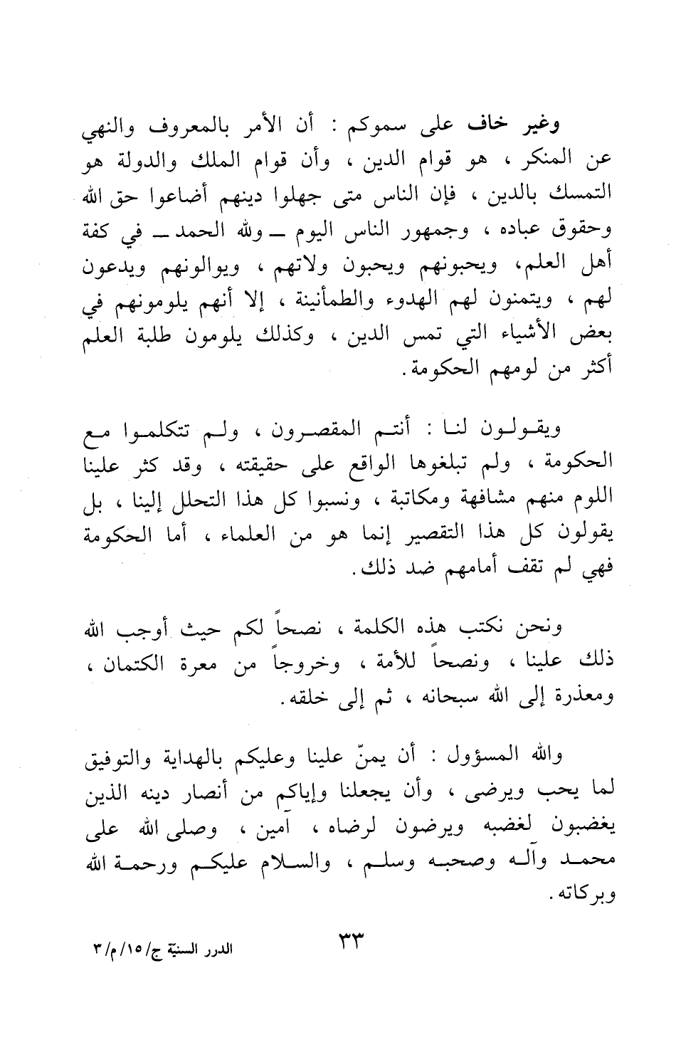 وغير خاف على سموكم أن الأمر بالمعروف والنهي عن المنكر، هو قوام الدين، وأن قوام الملك والدولة هو التمسك بالدين؛ فإن الناس متى جهلوا دينهم أضاعوا حد الله وحقوق عباده، وجمهور الناس اليوم- ولله الحمد- في كفة أهل العلم، ويحبونهم ويحبون ولاتهم، ويوالونهم ويدعون لهم، ويتمنون لهم الهدوء والطمأنينة، إلا أنهم يلومونهم في بعض الأشياء التي تمس الدين، وكذلك يلومون طلبة العلم أكثر من لومهم الحكومة.