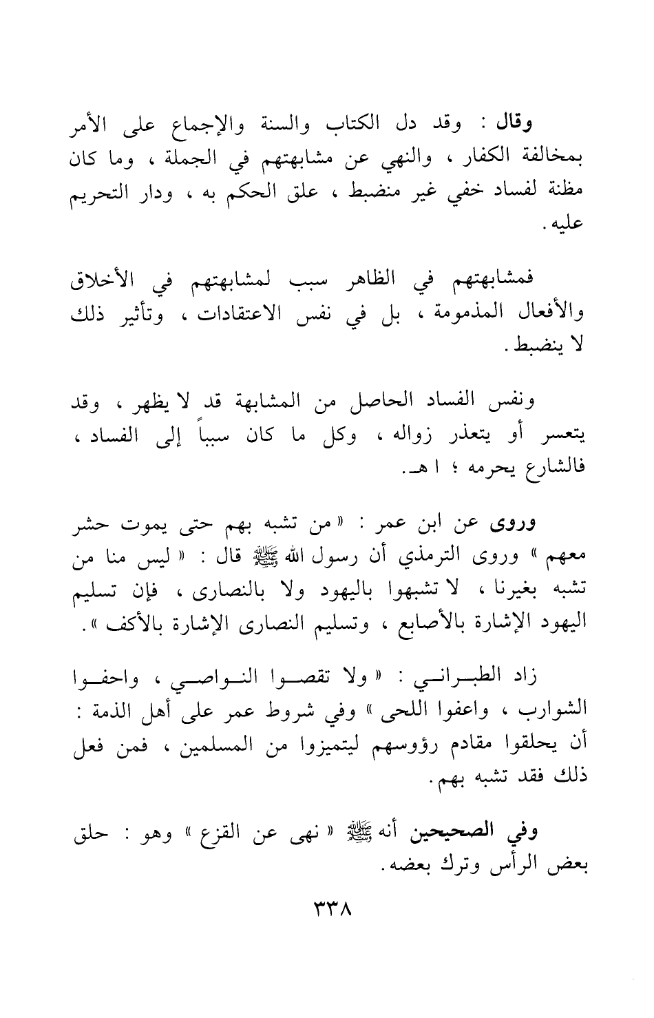 وروي عن ابن عمر: "من تشبه بهم حتى يموت حشر معهم"، وروى الترمذي أن رسول الله صلى الله عليه وسلم قال: "ليس منا من تشبه بغيرنا، لا تشبهوا باليهود ولا بالنصارى، فإن تسليم اليهود الإشارة بالأصابع، وتسليم النصارى الإشارة بالأكف" 1.