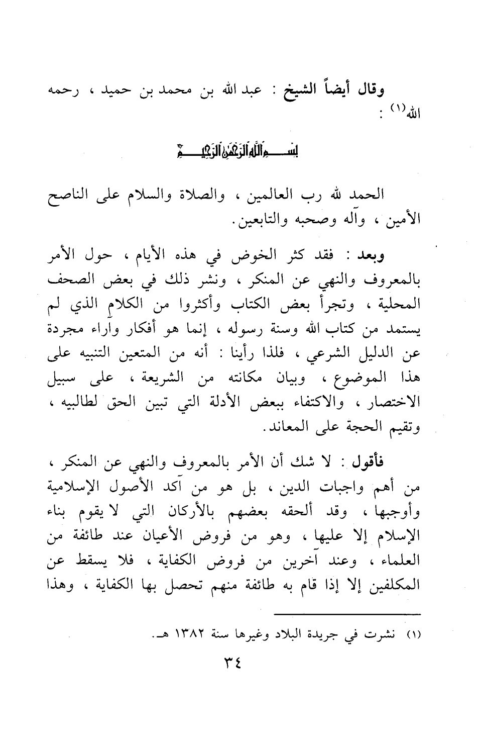 الحمد لله رب العالمين، والصلاة والسلام على الناصح الأمين، وآله وصحبه والتابعين. وبعد: فقد كثر الخوض في هذه الأيام، حول الأمر بالمعروف والنهي عن المنكر، ونشر ذلك في بعض الصحف المحلية؛ وتجرأ بعض الكتاب وأكثروا من الكلام الذي لم يستمد من كتاب الله وسنة رسوله، إنما هو أفكار وآراء مجردة عن الدليل الشرعي، فلذا رأينا: أنه من المتعين التنبيه على هذا الموضوع، وبيان مكانته من الشريعة، على سبيل الاختصار، والاكتفاء ببعض الأدلة التي تبين الحق لطالبيه، وتقيم الحجة على المعاند.