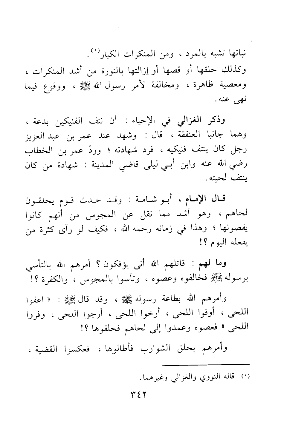 قال الإمام أبو شامة: وقد حدث قوم يحلقون لحاهم، وهو أشد مما نقل عن المجوس من أنهم كانوا يقصونها; وهذا في زمانه رحمه الله، فكيف لو رأى كثرة من يفعله اليوم؟!