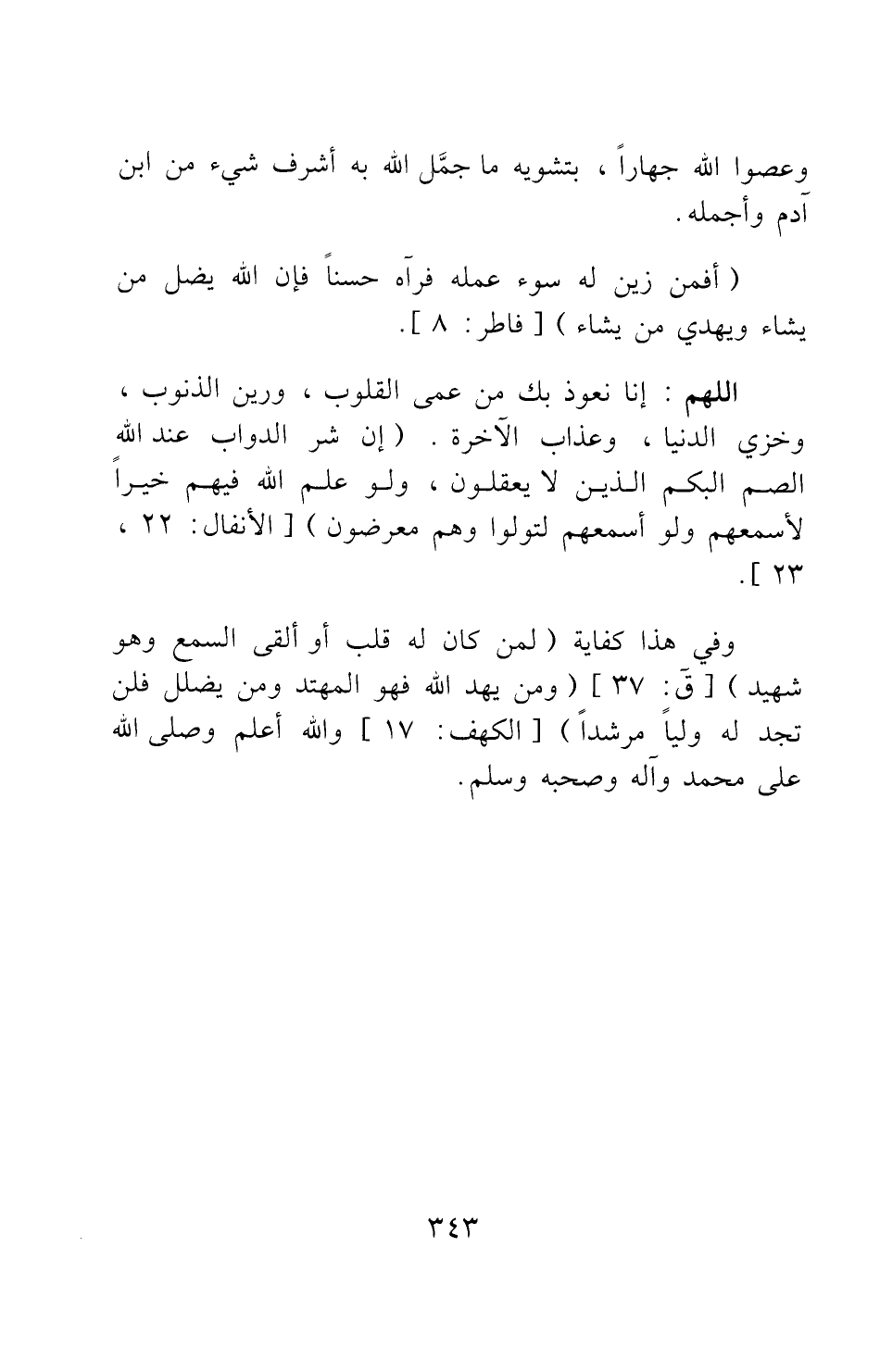 اللهم: إنا نعوذ بك من عمى القلوب، ورين الذنوب، وخزي الدنيا، وعذاب الآخرة. {إِنَّ شَرَّ الدَّوَابِّ عِنْدَ اللَّهِ الصُّمُّ الْبُكْمُ الَّذِينَ لا يَعْقِلُونَ وَلَوْ عَلِمَ اللَّهُ فِيهِمْ خَيْراً لَأسْمَعَهُمْ وَلَوْ أَسْمَعَهُمْ لَتَوَلَّوْا وَهُمْ مُعْرِضُونَ} [سورة الأنفال آية: 22-23] .
