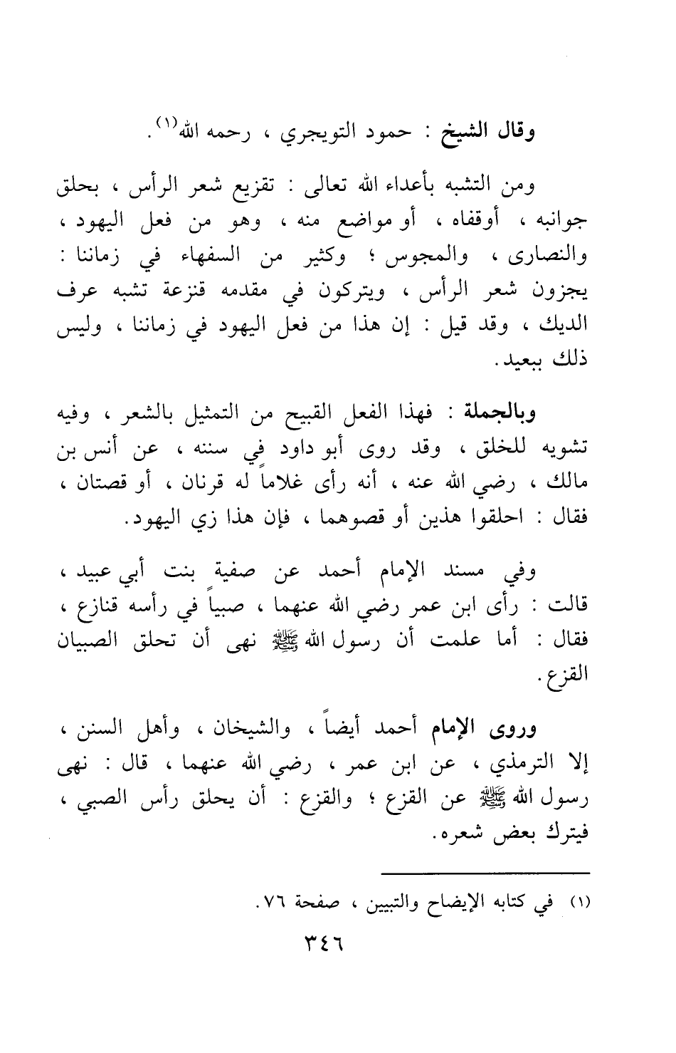 [قول الشيخ حمود التويجري في تقزيع شعر الرأس بحلق جوانبه أو قفاه]