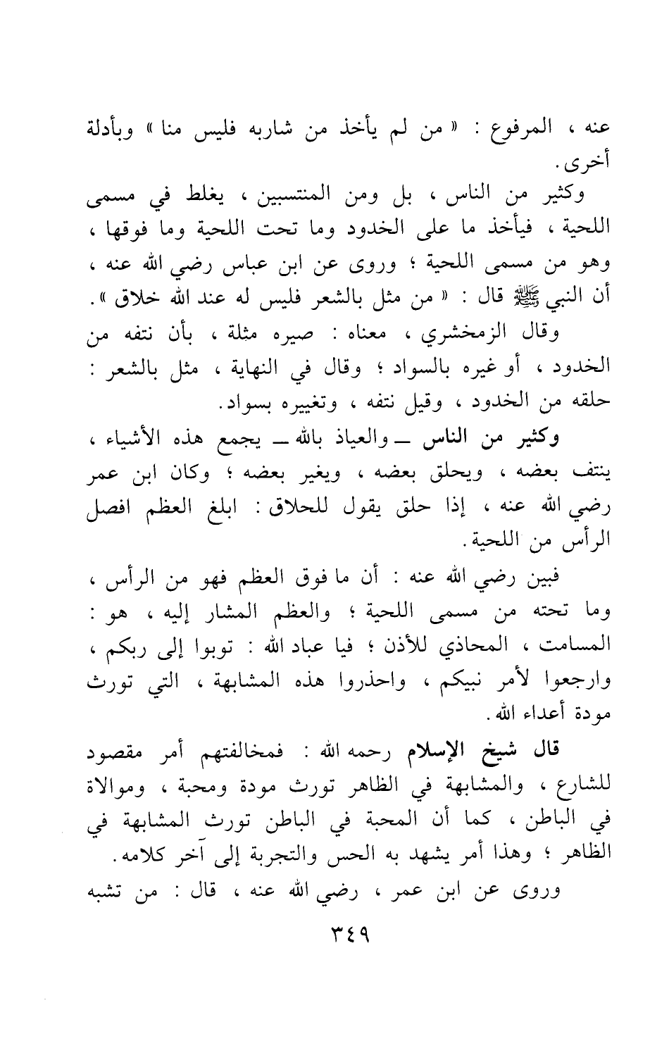فبين رضي الله عنه أن ما فوق العظم فهو من الرأس، وما تحته من مسمى اللحية; والعظم المشار إليه، هو: المسامت، المحاذي للأذن; فيا عباد الله: توبوا إلى ربكم، وارجعوا لأمر نبيكم، واحذروا هذه المشابهة، التي تورث مودة أعداء الله.