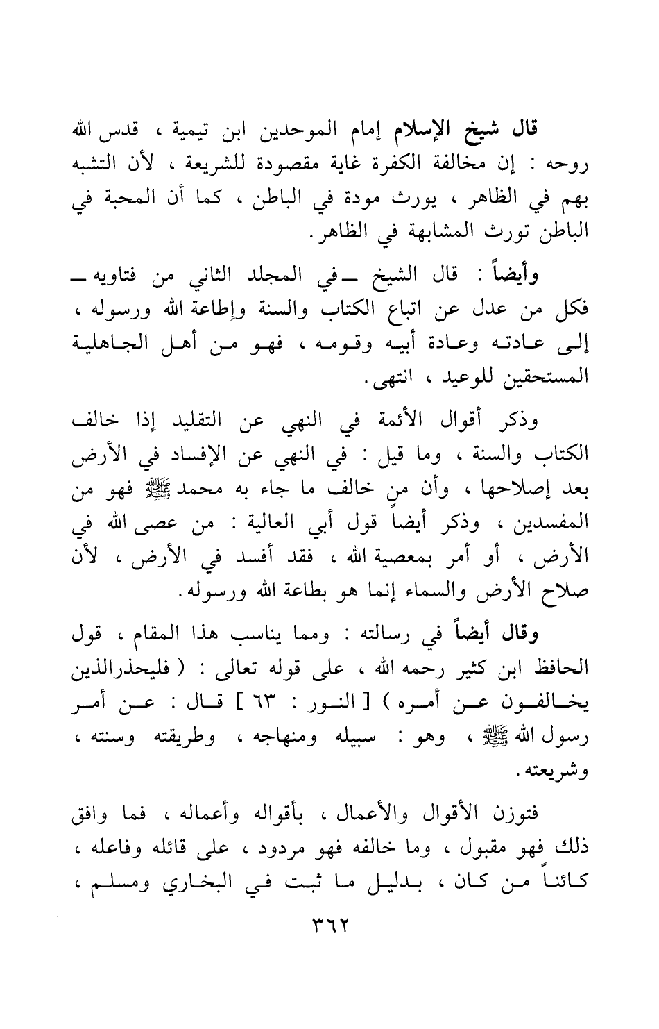 وقال أيضا في رسالته: ومما يناسب هذا المقام، قول الحافظ ابن كثير رحمه الله، على قوله تعالى: {فَلْيَحْذَرِ الَّذِينَ يُخَالِفُونَ عَنْ أَمْرِهِ} [سورة النور آية: 63] قال: عن أمر رسول الله صلى الله عليه وسلم وهو: سبيله ومنهاجه، وطريقته وسنته، وشريعته.