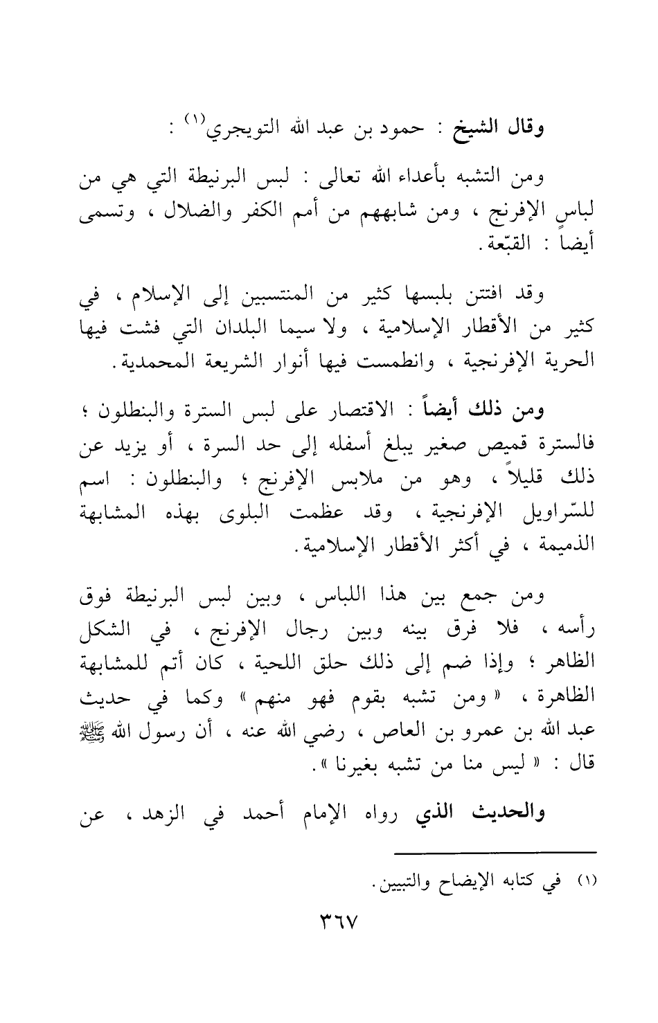 ومن جمع بين هذا اللباس، وبين لبس البرنيطة فوق رأسه، فلا فرق بينه وبين رجال الإفرنج، في الشكل الظاهر; وإذا ضم إلى ذلك حلق اللحية، كان أتم للمشابهة الظاهرة، و "من تشبه بقوم فهو منهم" 2 كما في حديث عبد الله بن عمرو بن العاص رضي الله عنه أن رسول الله صلى الله عليه وسلم قال: "ليس منا من تشبه بغيرنا" 3.