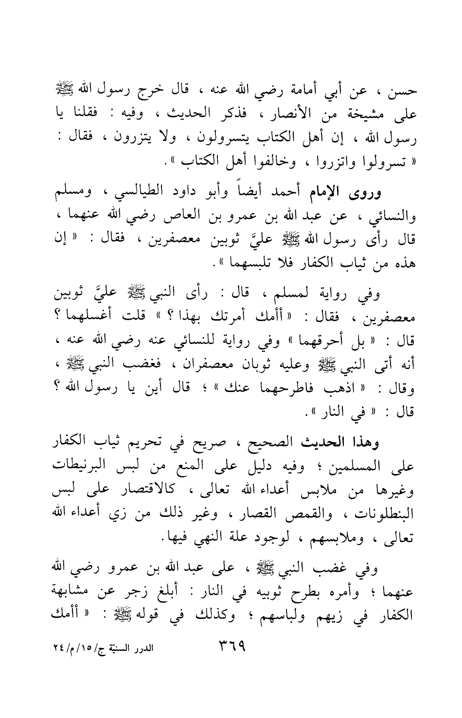 وروى الإمام أحمد أيضا وأبو داود الطيالسي، ومسلم والنسائي، عن عبد الله بن عمرو بن العاص رضي الله عنهما، قال رأى رسول الله صلى الله عليه وسلم عليَّ ثوبين معصفرين، فقال: "إن هذه من ثياب الكفار، فلا تلبسهما" 2.