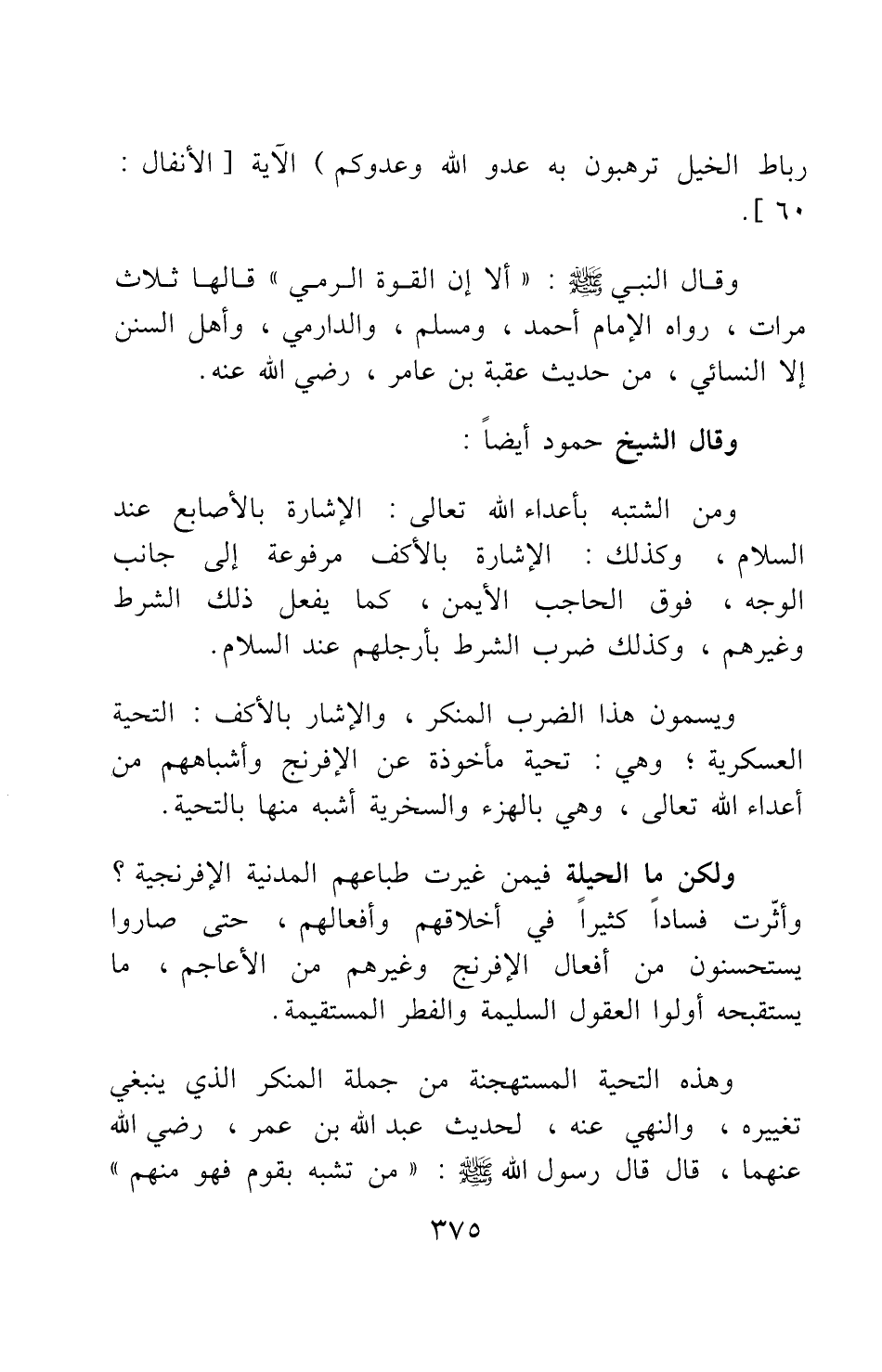 وقال الشيخ حمود أيضا: ومن التشبه بأعداء الله تعالى: الإشارة بالأصابع عند السلام، وكذلك: الإشارة بالأكف مرفوعة إلى جانب الوجه، فوق الحاجب الأيمن، كما يفعل ذلك الشرط وغيرهم، وكذلك ضرب الشرط بأرجلهم عند السلام.