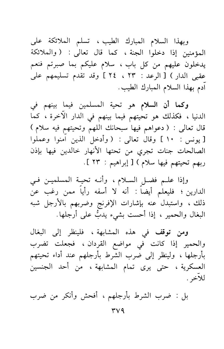 وإذا علم فضل السلام، وأنه تحية المسلمين في الدارين، فليعلم أيضا أنه لا أسفه رأيا ممن رغب عن ذلك، واستبدل عنه بإشارات الإفرنج وضربهم بالأرجل شبه البغال والحمير، إذا أحست بشيء يدبُّ على أرجلها.
