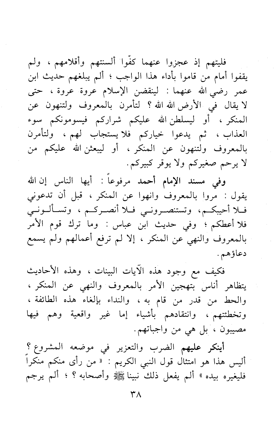 وفي مسند الإمام أحمد مرفوعا: "أيها الناس إن الله يقول: مروا بالمعروف وانهوا عن المنكر، قبل أن تدعوني فلا أحيبكم، وتستنصروني فلا أنصركم، وتسألوني فلا أعطكم" 3، وفي حديث ابن عباس: "وما ترك قوم الأمر بالمعروف والنهي عن المنكر، إلا لم ترفع أعمالهم، ولم يسمع دعاؤهم".