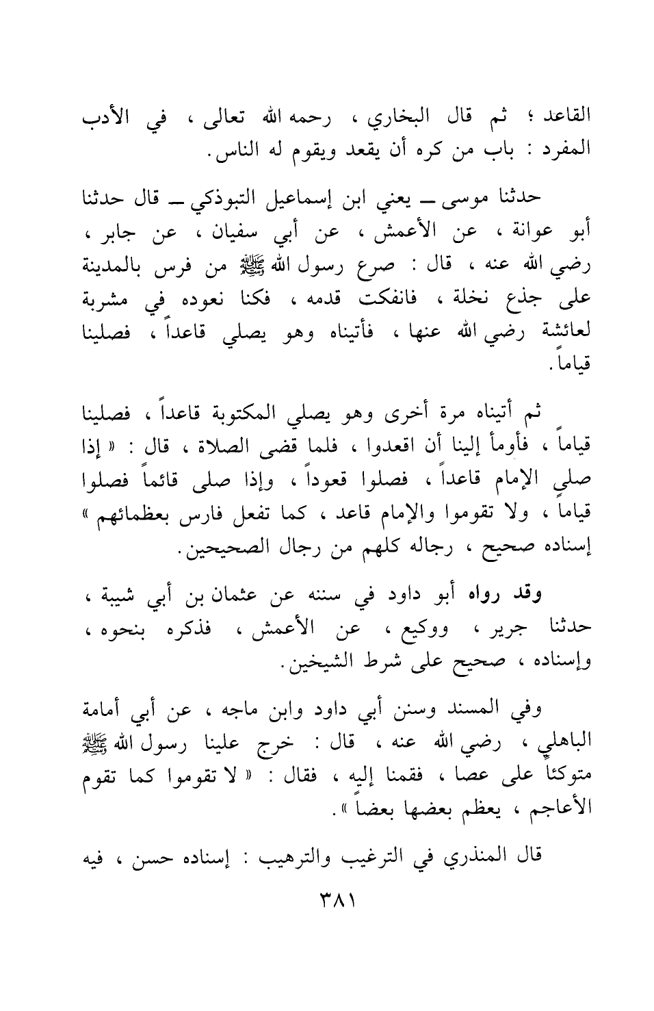 حدثنا موسى - يعني ابن إسماعيل التبوذكي – قال: حدثنا أبو عوانة، عن الأعمش، عن أبي سفيان، عن جابر، رضي الله عنه قال: "صرع رسول الله صلى الله عليه وسلم من فرس بالمدينة على جذع نخلة، فانفكت قدمه، فكنا نعوده في مشربة لعائشة رضي الله عنها، فأتيناه وهو يصلي قاعدا، فصلينا قياما.