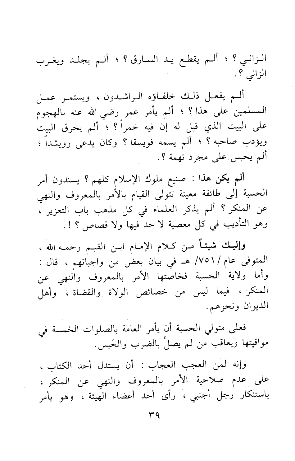 "ألم يأمر عمر رضي الله عنه بالهجوم على البيت الذي قيل له إن فيه خمرا؟ ألم يحرق البيت ويؤدب صاحبه؟ ألم يسمه فويسقا؟ وكان يدعى رويشدا، ألم يحبس على مجرد تهمة؟ " ألم يكن هذا صنيع ملوك الإسلام كلهم.؟ يسندون أمر الحسبة إلى طائفة معينة تتولى القيام بالأمر بالمعروف والنهي عن المنكر؟ ألم يذكر العلماء في كل مذهب باب التعزير، وهو التأديب في كل معصية لا حد فيها ولا قصاص؟.