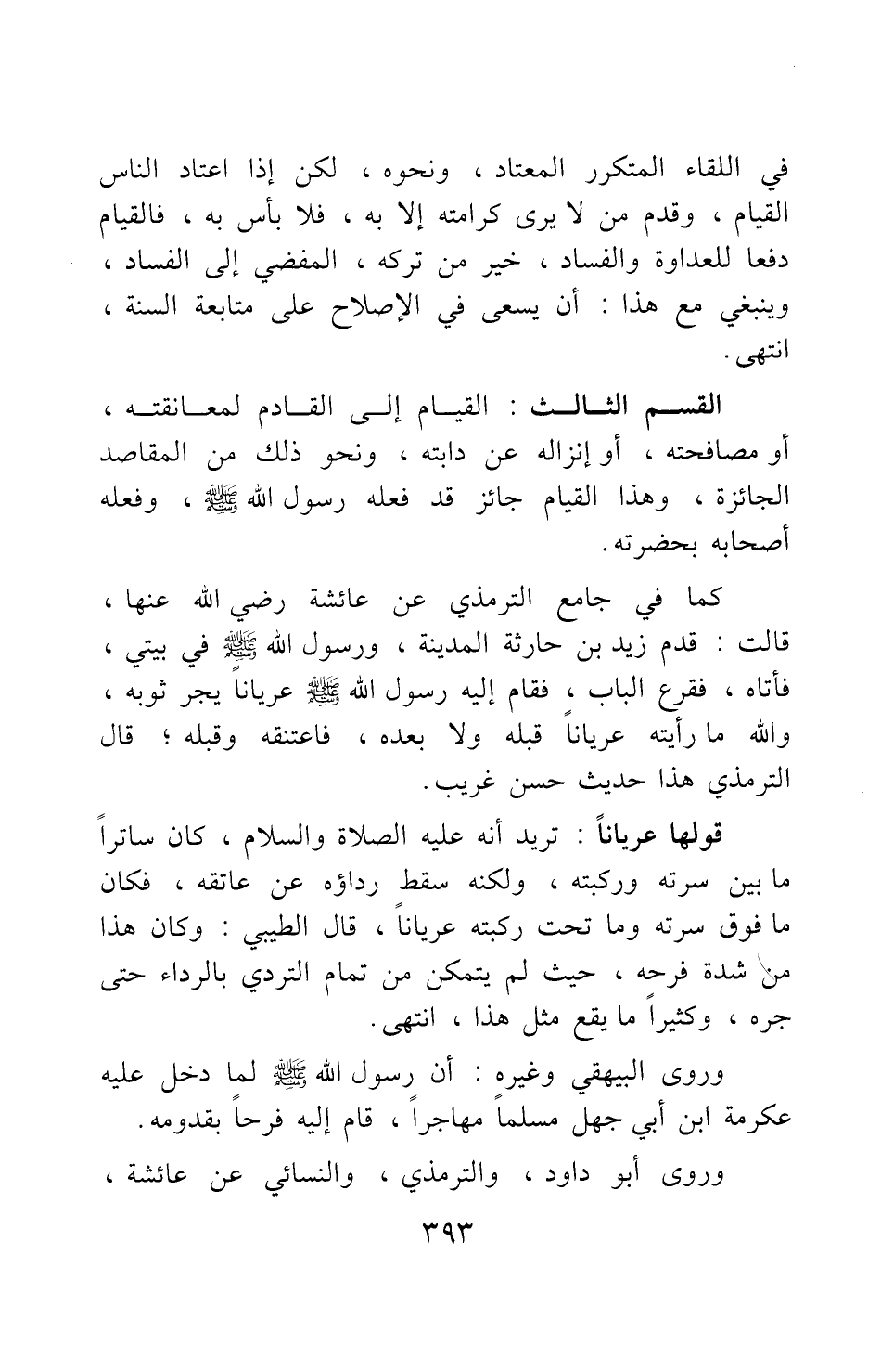 القسم الثالث: القيام إلى القادم لمعانقته، أو مصافحته، أو إنزاله عن دابته، ونحو ذلك من المقاصد الجائزة، وهذا القيام جائز قد فعله رسول الله صلى الله عليه وسلم وفعله أصحابه بحضرته.