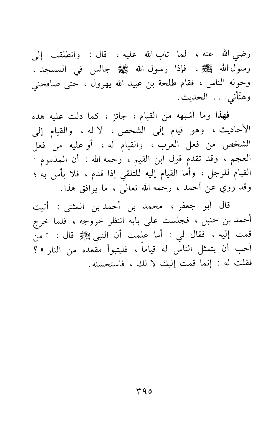 فهذا وما أشبهه من القيام، جائز، كما دلت عليه هذه الأحاديث؛ وهو قيام إلى الشخص، لا له؛ والقيام إلى الشخص من فعل العرب، والقيام له، أو عليه من فعل العجم. وقد تقدم قول ابن القيم، رحمه الله: أن المذموم القيام للرجل، وأما القيام إليه للتلقي إذا قدم، فلا بأس به، وقد روي عن أحمد، رحمه الله تعالى، ما يوافق هذا.