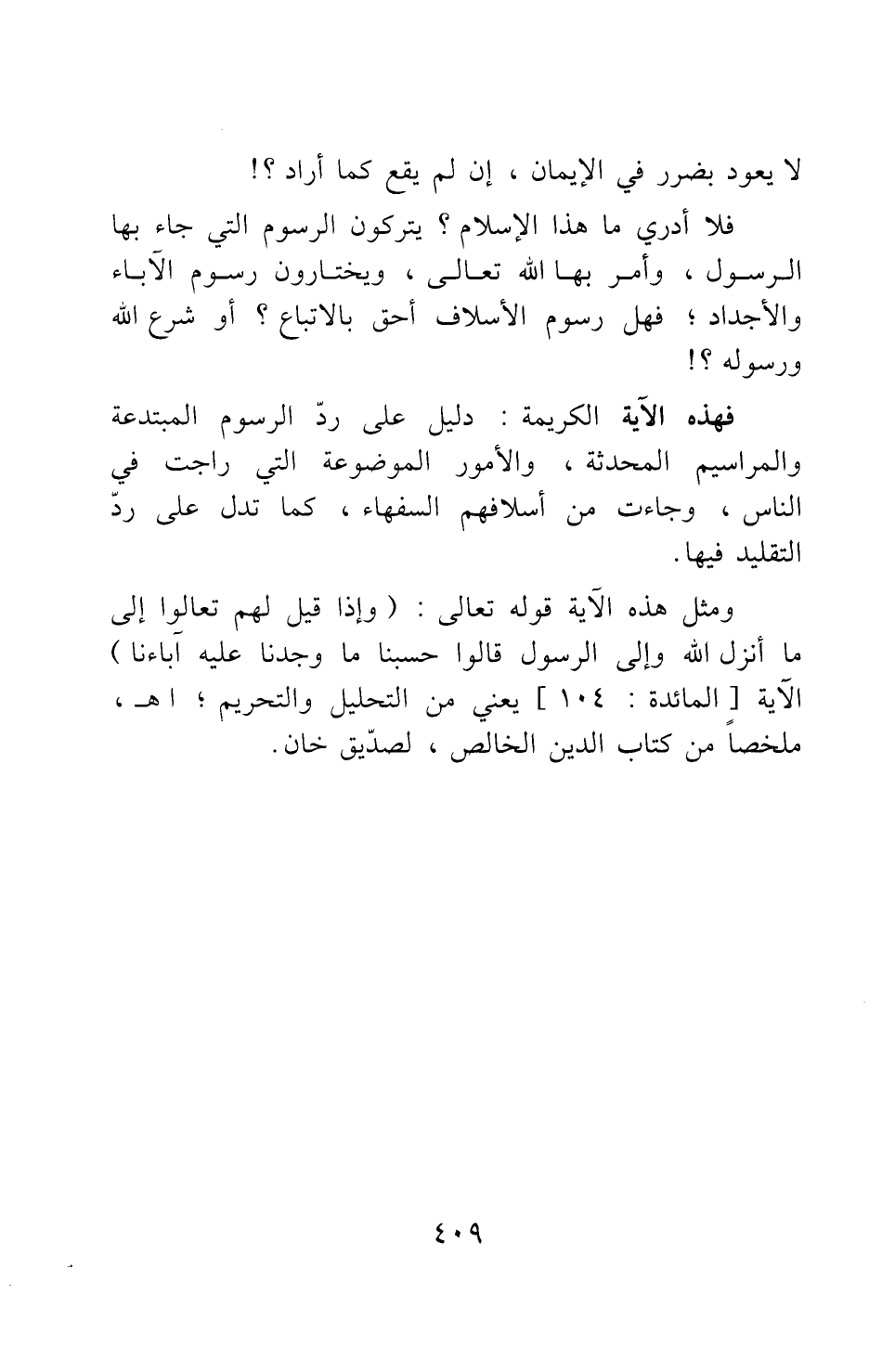 فلا أدري ما هذا الإسلام؟ يتركون الرسوم التي جاء بها الرسول، وأمر بها الله تعالى، ويختارون رسوم الآباء والأجداد، فهل رسوم الأسلاف أحق بالاتباع؟ أو شرع الله ورسوله؟!