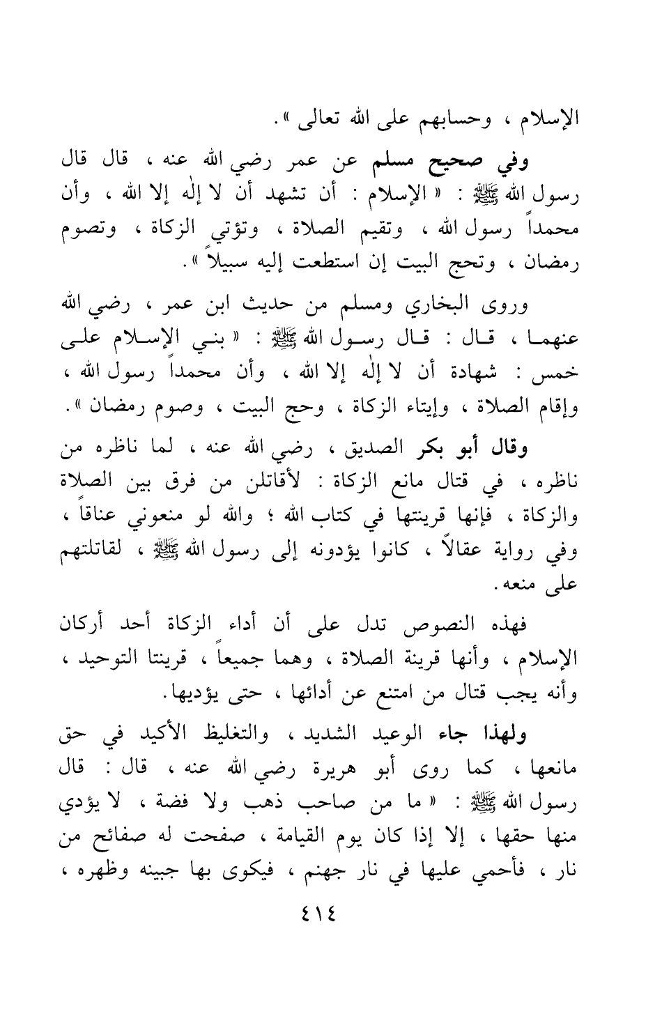 وقال أبو بكر الصديق، رضي الله عنه لما ناظره من ناظره، في قتال مانع الزكاة: "لأقاتلن من فرق بين الصلاة والزكاة، فإنها قرينتها في كتاب الله. والله لو منعوني عناقا، وفي رواية عقالا، كانوا يؤدونه إلى رسول الله صلى الله عليه وسلم لقاتلتهم على منعه".