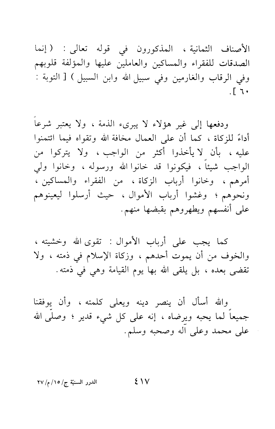 ودفعها إلى غير هؤلاء لا يبرئ الذمة، ولا يعتبر شرعا أداء للزكاة، كما أن على العمالة مخافة الله وتقواه فيما ائتمنوا عليه، بأن لا يأخذوا أكثر من الواجب، ولا يتركوا من الواجب شيئا، فيكونوا قد خانوا الله ورسوله، وخانوا ولي أمرهم، وخانوا أرباب الزكاة من الفقراء والمساكين ونحوهم وغشوا أرباب الأموال، حيث أرسلوا ليعينوهم على أنفسهم ويطهروهم بقبضها منهم.