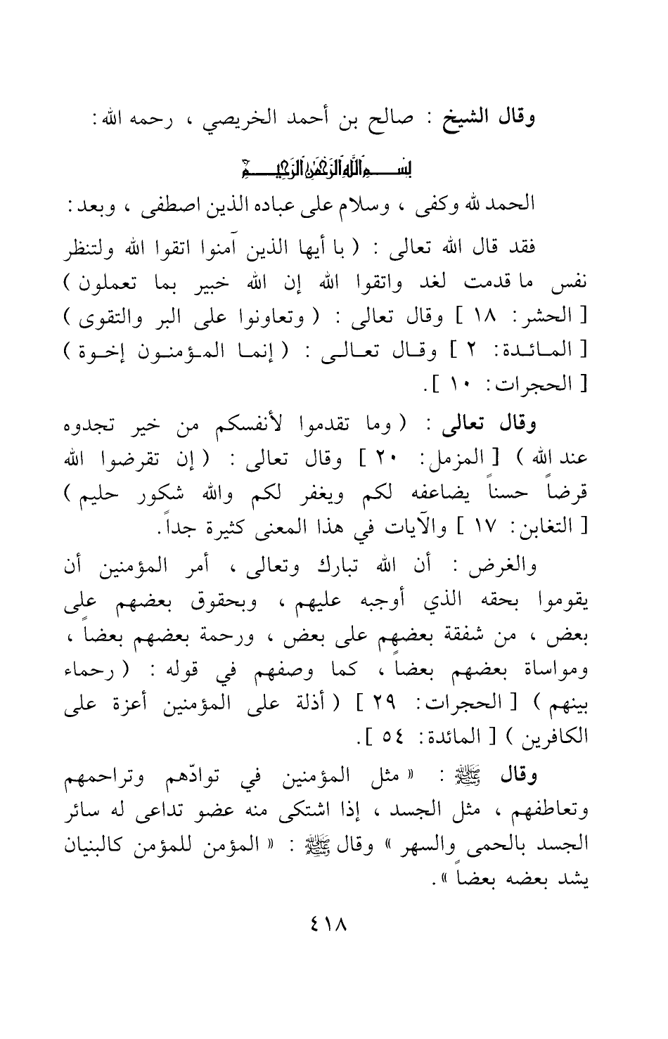 الحمد لله وكفى، وسلام على عباده الذين اصطفى، وبعد: فقد قال الله تعالى: {يَا أَيُّهَا الَّذِينَ آمَنُوا اتَّقُوا اللَّهَ وَلْتَنْظُرْ نَفْسٌ مَا قَدَّمَتْ لِغَدٍ وَاتَّقُوا اللَّهَ إِنَّ اللَّهَ خَبِيرٌ بِمَا تَعْمَلُونَ} [سورة الحشر آية: 18] ، وقال تعالى: {وَتَعَاوَنُوا عَلَى الْبِرِّ وَالتَّقْوَى} [سورة المائدة آية: 2] ، وقال تعالى: {إِنَّمَا الْمُؤْمِنُونَ إِخْوَةٌ} [سورة الحجرات آية: 10] .
