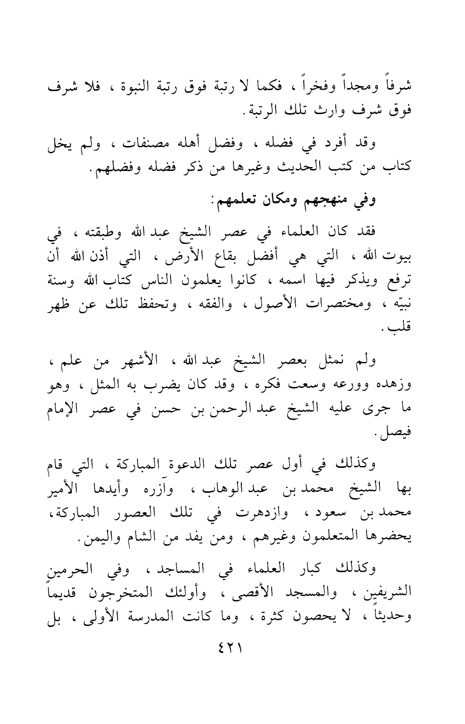 ولم نمثل بعصر الشيخ عبد الله، الأشهر من علم، وزهده وورعه وسعة فكره؛ وقد كان يضرب به المثل، وهو ما جرى عليه الشيخ عبد الرحمن بن حسن في عصر الإمام فيصل.