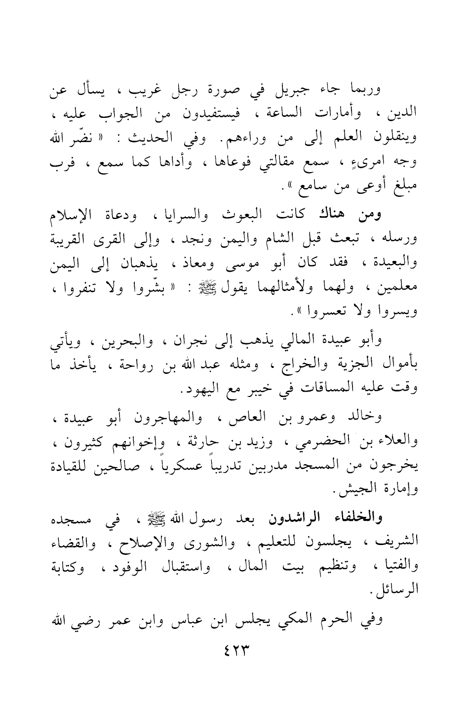 ومن هناك كانت البعوث والسرايا، ودعاة الإسلام ورسله، تبعث قبل الشام واليمن ونجد، وإلى القرى القريبة والبعيدة؛ فقد كان أبو موسى ومعاذ، يذهبان إلى اليمن معلمين، ولهما ولأمثالهما يقول صلى الله عليه وسلم: "بشِّروا ولا تنفروا، ويسروا ولا تعسروا" 2.