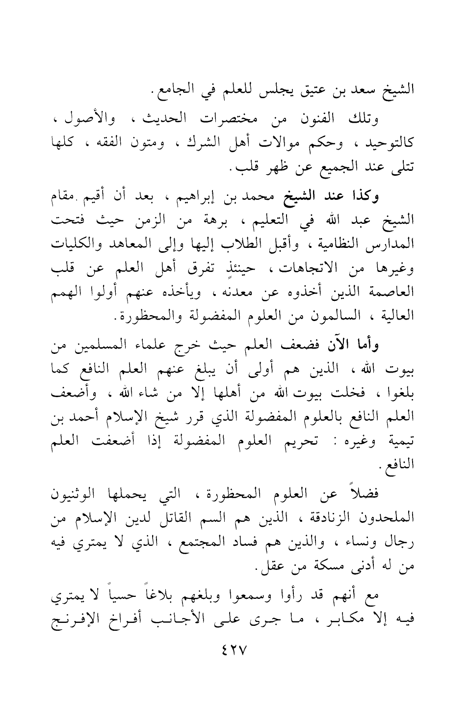 وكذا عند الشيخ محمد بن إبراهيم، بعد أن أقيم مقام الشيخ عبد الله في التعليم، برهة من الزمن حيث فتحت المدارس النظامية، وأقبل الطلاب إليها وإلى المعاهد والكليات وغيرها من الاتجاهات؛ حينئذ تفرق أهل العلم عن قلب العاصمة الذين أخذوه عن معدنه، ويأخذه عنهم أولو الهمم العالية، السالمون من العلوم المفضولة والمحظورة.