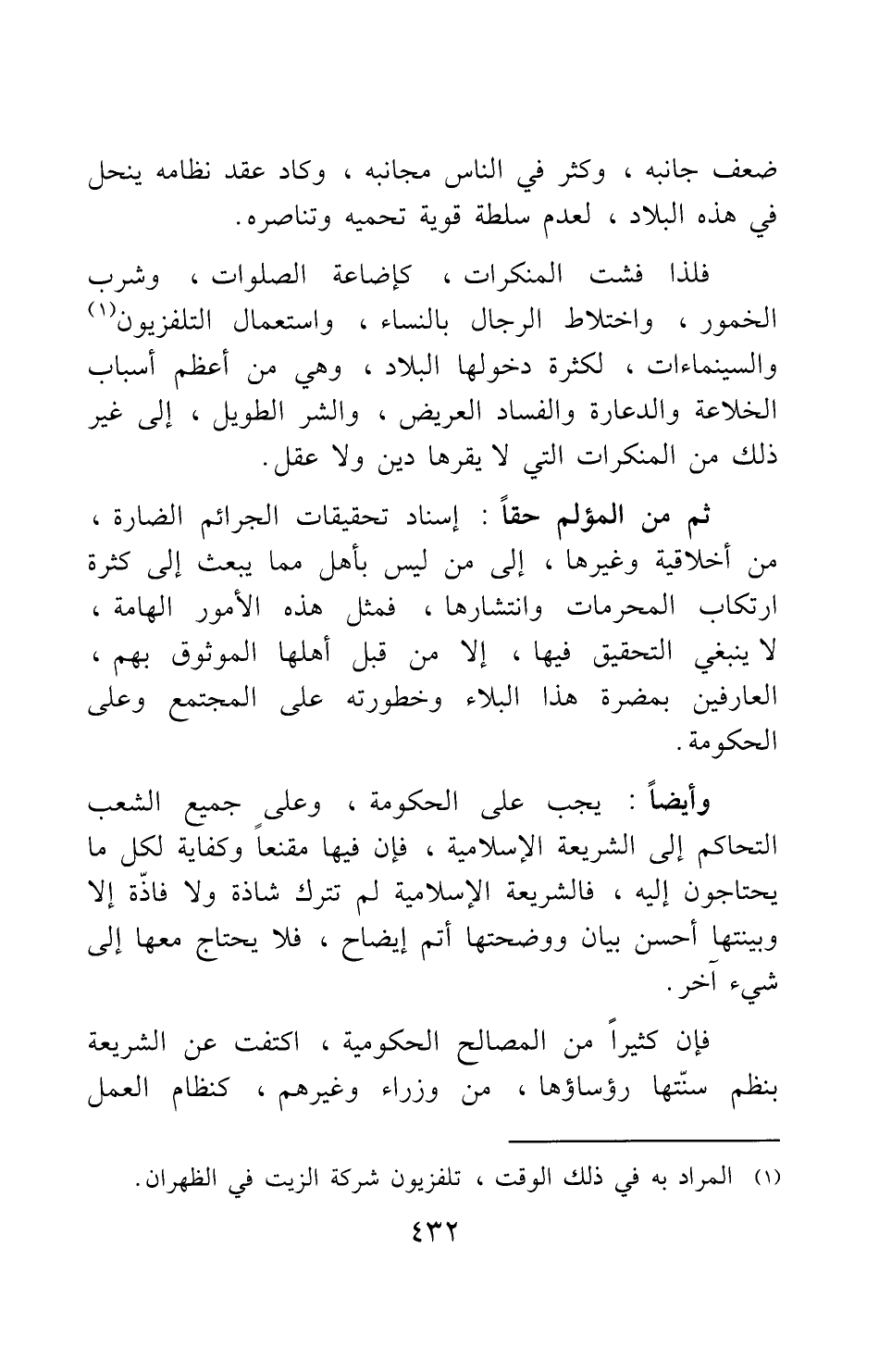 فلذا فشت المنكرات، كإضاعة الصلوات، وشرب الخمور، واختلاط الرجال بالنساء واستعمال التلفزيون 1 والسينماءات، لكثرة دخولها البلاد، وهي من أعظم أسباب الخلاعة والدعارة والفساد العريض، والشر الطويل، إلى غير ذلك من المنكرات التي لا يقرها دين ولا عقل.