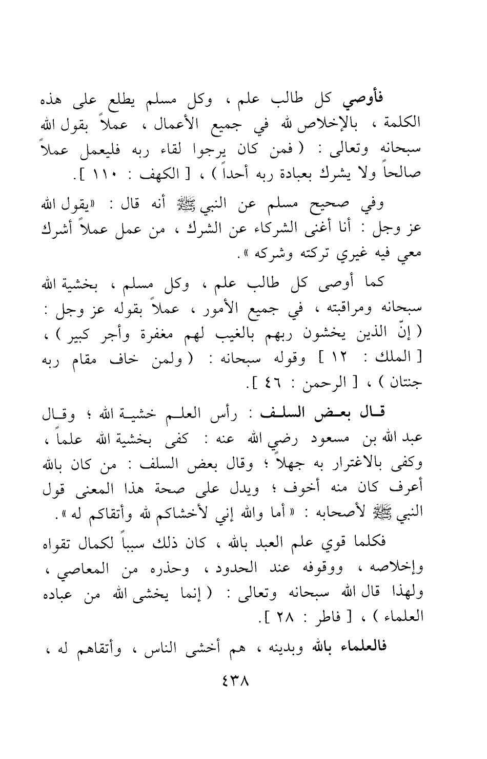 كما أوصي كل طالب علم، وكل مسلم، بخشية الله سبحانه ومراقبته، في جميع الأمور، عملا بقوله عز وجل: {إِنَّ الَّذِينَ يَخْشَوْنَ رَبَّهُمْ بِالْغَيْبِ لَهُمْ مَغْفِرَةٌ وَأَجْرٌ كَبِيرٌ} [سورة الملك آية: 12] ، وقوله سبحانه: {وَلِمَنْ خَافَ مَقَامَ رَبِّهِ جَنَّتَانِ} [سورة الرحمن آية: 46] .