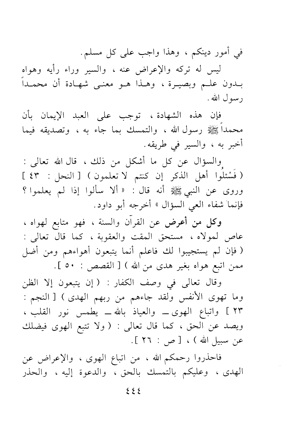 فإن هذه الشهادة، توجب على العبد الإيمان بأن محمدا صلى الله عليه وسلم رسول الله، والتمسك بما جاء به، وتصديقه فيما أخبر به، والسير في طريقه، والسؤال عن كل ما أشكل من ذلك، قال الله تعالى: {فَاسْأَلُوا أَهْلَ الذِّكْرِ إِنْ كُنْتُمْ لا تَعْلَمُونَ} [سورة النحل آية: 43] . وروي عن النبي صلى الله عليه وسلم أنه قال: "ألا سألوا إذا لم يعلموا؟ فإنما شفاء العي السؤال" 1 أخرجه أبو داود.