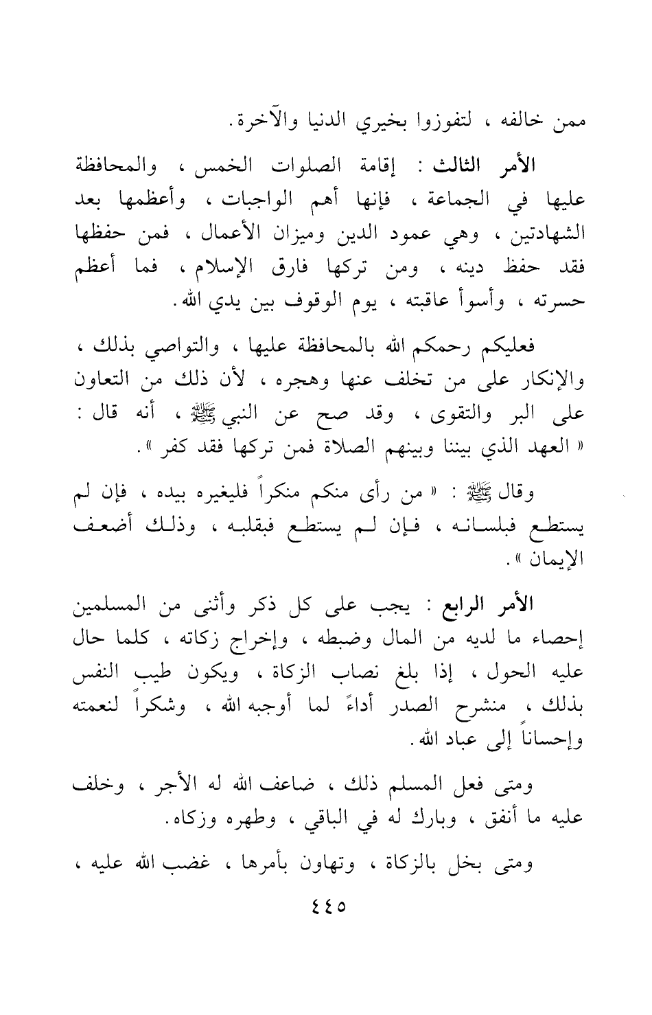 الأمر الثالث: إقامة الصلوات الخمس والمحافظة عليها في الجماعة فإنها أهم الواجبات وأعظمها بعد الشهادتين؛ وهي عمود الدين وميزان الأعمال، فمن حفظها فقد حفظ دينه، ومن تركها فارق الإسلام؛ فما أعظم حسرته، وأسوأ عاقبته، يوم الوقوف بين يدي الله.