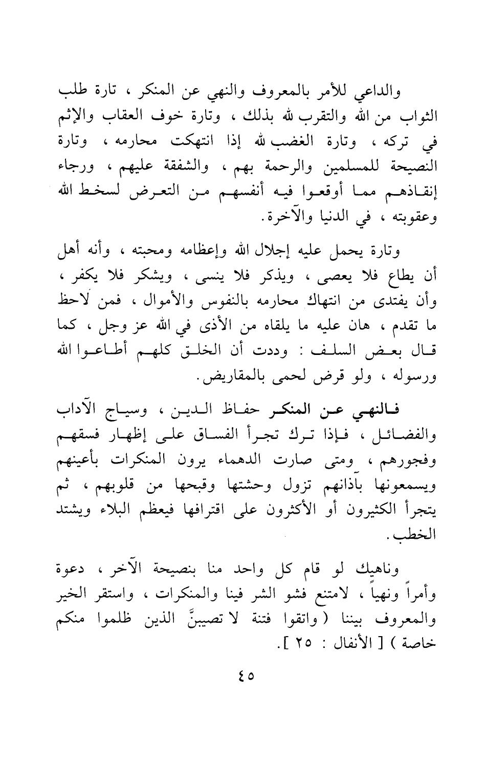 والداعي للأمر بالمعروف والنهي عن المنكر، تارة طلب الثواب من الله والتقرب لله بذلك، وتارة خوف العقاب والإثم في تركه، وتارة الغضب لله إذا انتهكت محارمه، وتارة النصيحة للمسلمين والرحمة بهم، والشفقة عليهم، ورجاء إنقاذهم مما أوقعوا فيه أنفسهم من التعرض لسخط الله وعقوبته، في الدنيا والآخرة.