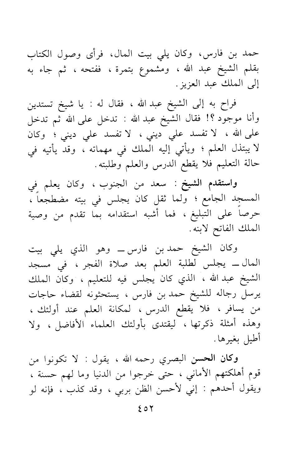 وكان الشيخ حمد بن فارس - وهو الذي يلي بيت المال - يجلس لطلبة العلم بعد صلاة الفجر، في مسجد الشيخ عبد الله، الذي كان يجلس فيه للتعليم؛ وكان الملك يرسل رجاله للشيخ حمد بن فارس، يستحثونه لقضاء حاجات من يسافر، فلا يقطع الدرس، لمكانة العلم عند أولئك. وهذه أمثلة ذكرتها، ليقتدى بأولئك العلماء الأفاضل، ولا أطيل بغيرها.