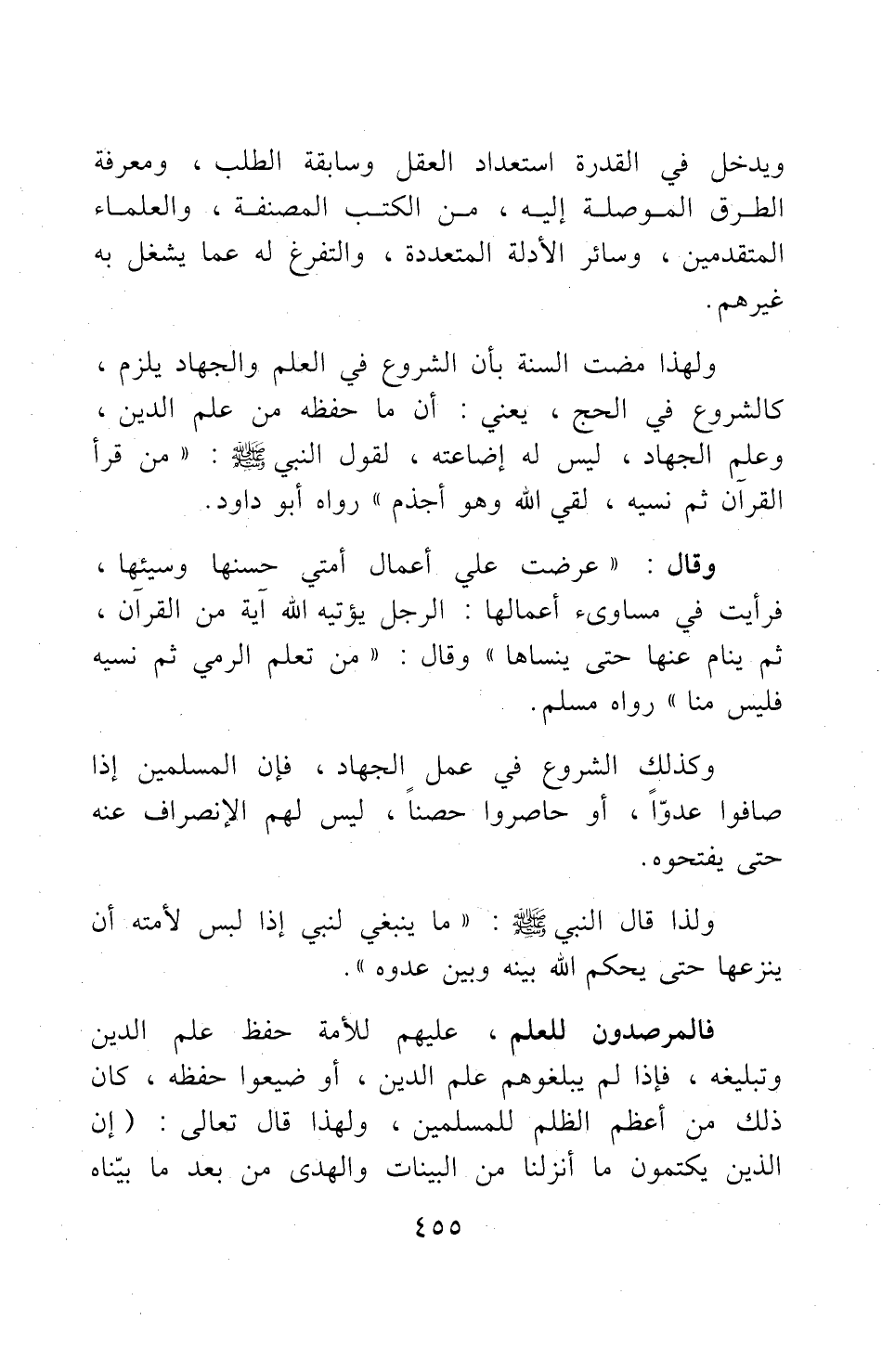 ولهذا مضت السنة بأن الشروع في العلم والجهاد يلزم كالشروع في الحج، يعني: أن ما حفظه من علم الدين وعلم الجهاد، ليس له إضاعته، لقول النبي صلى الله عليه وسلم "من قرأ القرآن ثم نسيه، لقي الله وهو أجذم" 1 رواه أبو داود.