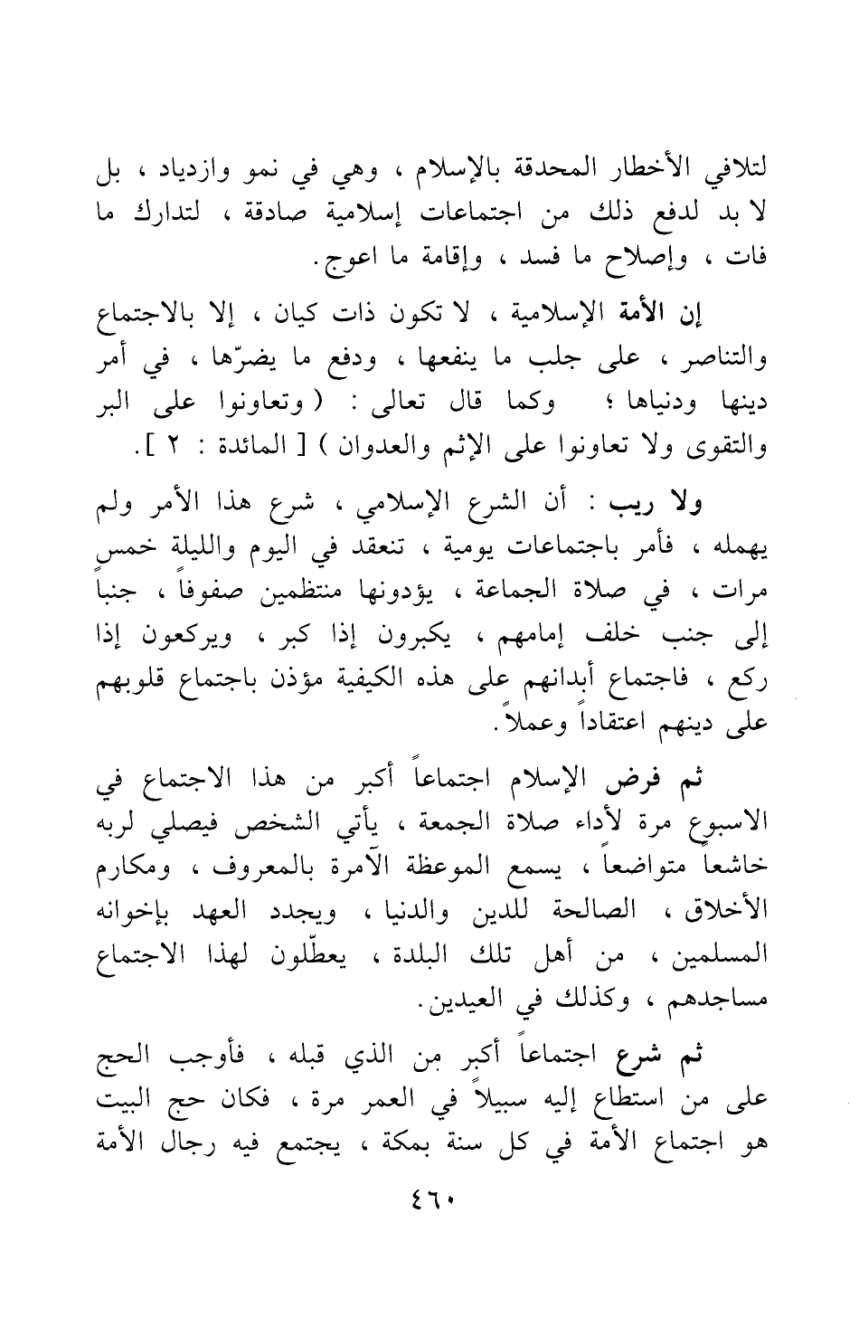 إن الأمة الإسلامية لا تكون ذات كيان، إلا بالاجتماع والتناصر على جلب ما ينفعها، ودفع ما يضرّها، في أمر دينها ودنياها; وكما قال تعالى: {وَتَعَاوَنُوا عَلَى الْبِرِّ وَالتَّقْوَى وَلا تَعَاوَنُوا عَلَى الْأِثْمِ وَالْعُدْوَانِ} [سورة المائدة آية: 2] .