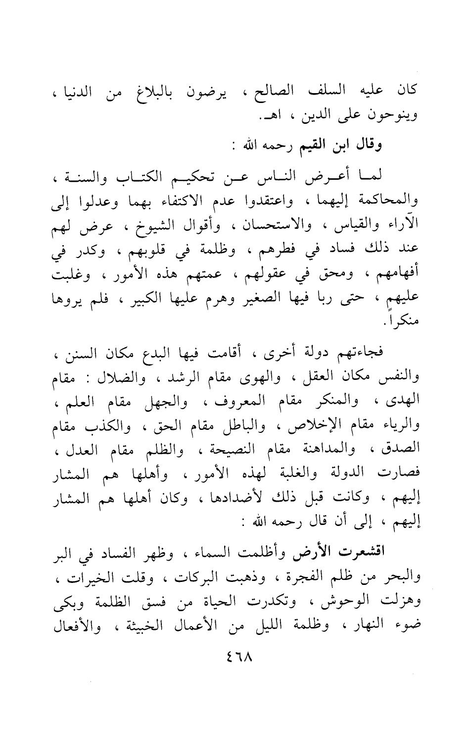 فجاءتهم دولة أخرى أقامت فيها البدع مكان السنن، والنفس مكان العقل، والهوى مقام الرشد، والضلال مقام الهدى، والمنكر مقام المعروف، والجهل مقام العلم، والرياء مقام الإخلاص، والباطل مقام الحق، والكذب مقام الصدق، والمداهنة مقام النصيحة، والظلم مقام العدل، فصارت الدولة والغلبة لهذه الأمور، وأهلها هم المشار إليهم، وكانت قبل ذلك لأضدادها، وكان أهلها هم المشار إليهم، إلى أن قال رحمه الله: