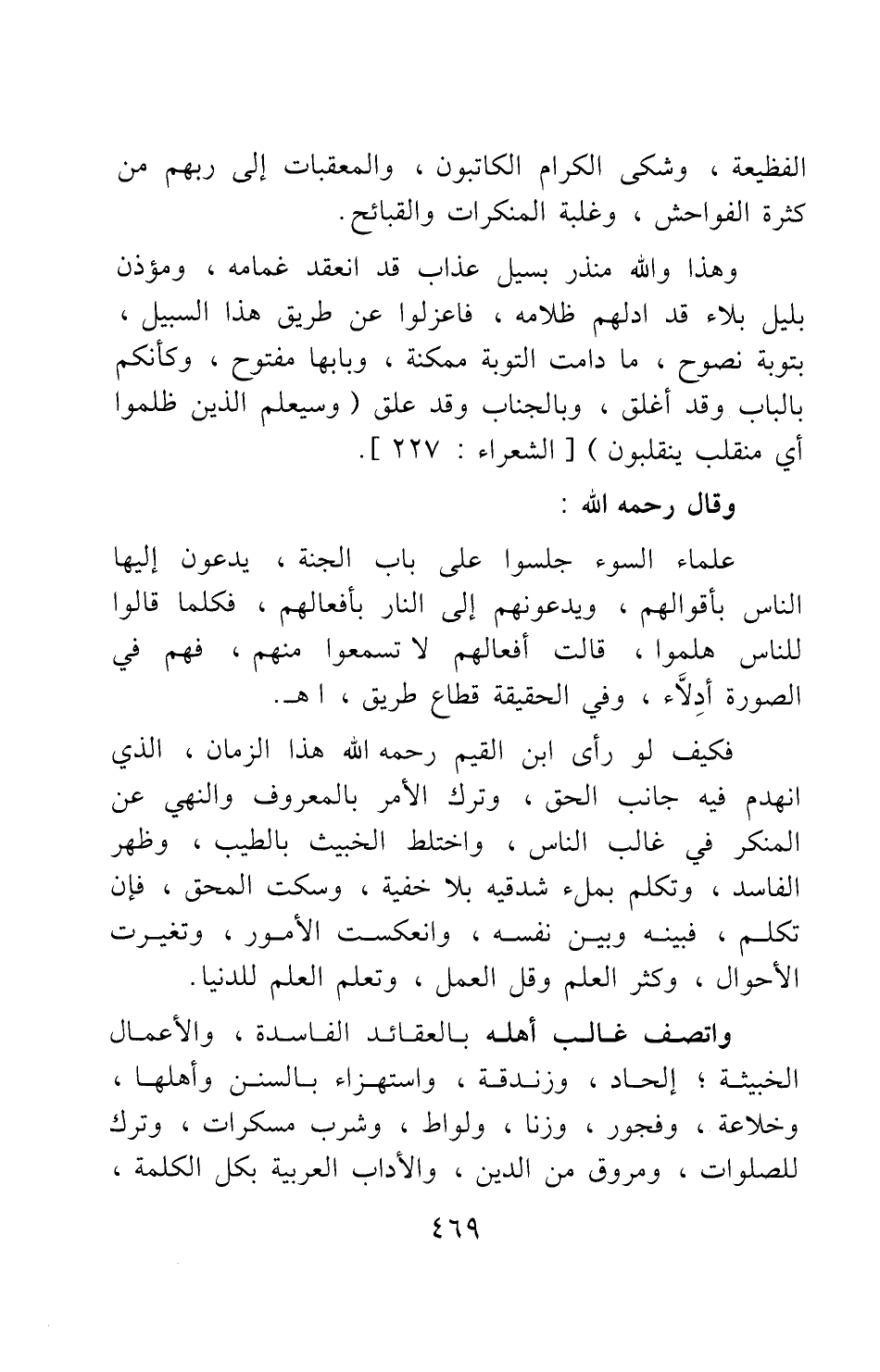 وهذا والله منذر بسيل عذاب قد انعقد غمامه، ومؤذن بليل بلاء قد ادلهم ظلامه، فاعزلوا عن طريق هذا السبيل، بتوبة نصوح، ما دامت التوبة ممكنة وبابها مفتوح، وكأنكم بالباب وقد أغلق، وبالجناب وقد علق {وَسَيَعْلَمُ الَّذِينَ ظَلَمُوا أَيَّ مُنْقَلَبٍ يَنْقَلِبُونَ} [سورة الشعراء آية: 227] .