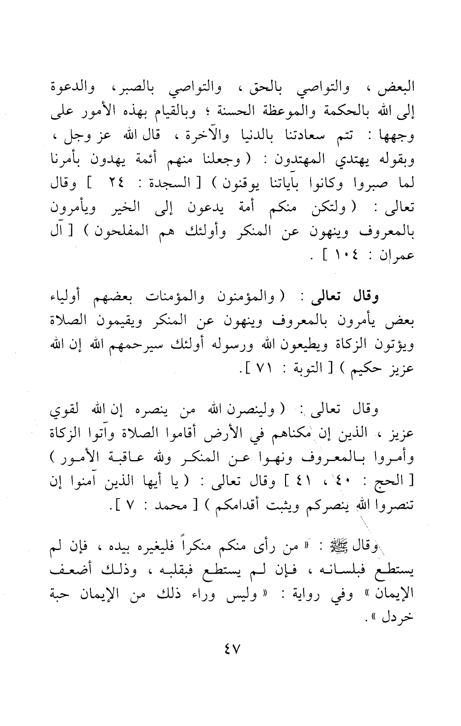 وقال تعالى: {وَلَيَنْصُرَنَّ اللَّهُ مَنْ يَنْصُرُهُ إِنَّ اللَّهَ لَقَوِيٌّ عَزِيزٌ الَّذِينَ إِنْ مَكَّنَّاهُمْ فِي الْأَرْضِ أَقَامُوا الصَّلاةَ وَآتَوُا الزَّكَاةَ وَأَمَرُوا بِالْمَعْرُوفِ وَنَهَوْا عَنِ الْمُنْكَرِ وَلِلَّهِ عَاقِبَةُ الْأُمُورِ} [سورة الحج آية: 40-41] ، وقال تعالى: {يَا أَيُّهَا الَّذِينَ آمَنُوا إِنْ تَنْصُرُوا اللَّهَ يَنْصُرْكُمْ وَيُثَبِّتْ أَقْدَامَكُمْ} [سورة محمد آية: 7] ، وقال صلى الله عليه وسلم "من رأى منكم منكرا فليغيره بيده، فإن لم يستطع فبلسانه، فإن لم يستطع فبقلبه، وذلك أضعف الإيمان" 1، وفي رواية: "وليس وراء ذلك من الإيمان حبة خردل" 2.