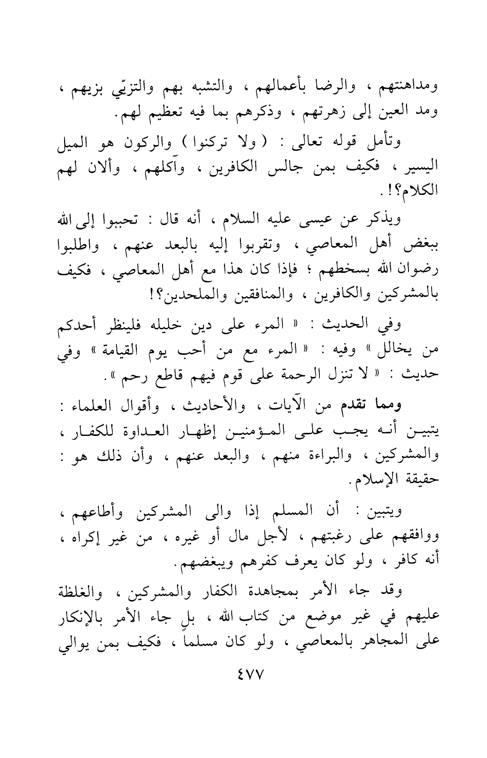 وتأمل قوله تعالى: {وَلا تَرْكَنُوا} [سورة هود آية: 113] والركون هو الميل اليسير، فكيف بمن جالس الكافرين، وآكلهم، وألان لهم الكلام؟!.