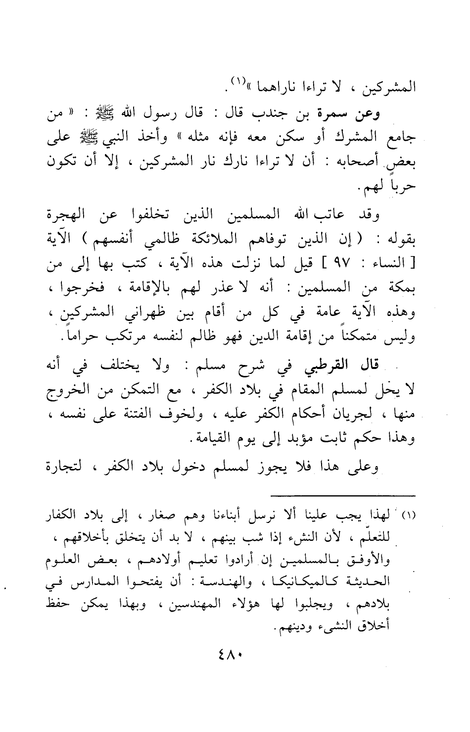وعن سمرة بن جندب قال: قال رسول الله صلى الله عليه وسلم: "من جامع المشرك أو سكن معه، فإنه مثله" 2 وأخذ النبي صلى الله عليه وسلم على بعض أصحابه: أن لا تراءا نارك نار المشركين، إلا أن تكون حربا لهم.