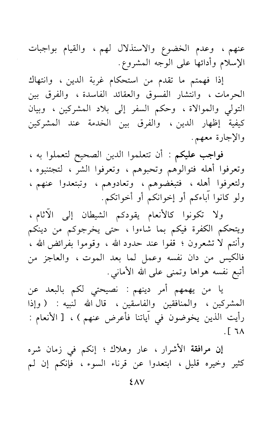 إذا فهمتم ما تقدم من استحكام غربة الدين، وانتهاك الحرمات، وانتشار الفسوق والعقائد الفاسدة، والفرق بين التولي والموالاة، وحكم السفر إلى بلاد المشركين، وبيان كيفية إظهار الدين، والفرق بين الخدمة عند المشركين والإجارة معهم، فواجب عليكم أن تتعلموا الدين الصحيح لتعملوا به، وتعرفوا أهله فتوالوهم وتحبوهم، وتعرفوا الشر لتجتنبوه، ولتعرفوا أهله فتبغضوهم، وتعادوهم، وتبتعدوا عنهم، ولو كانوا آباءكم أو إخوانكم أو أخواتكم.