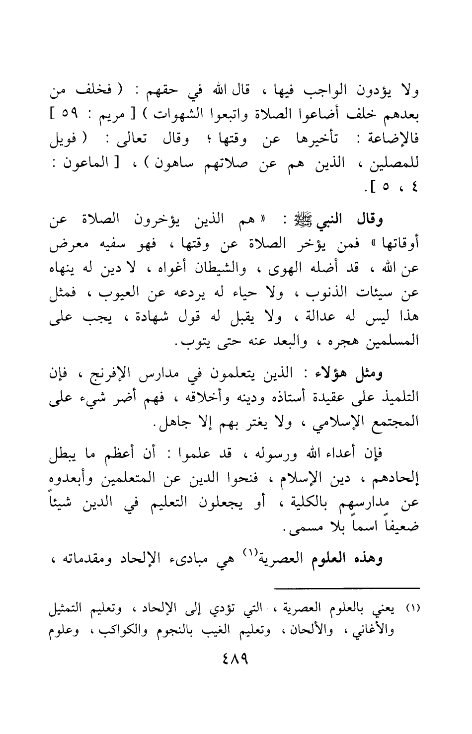 1 يعني بالعلوم العصرية, التي تؤدي إلى الإلحاد, وتعليم التمثيل والأغاني, والألحان, وتعليم الغيب بالنجوم والكواكب, وعلوم الفلسفة. أما العلوم الأخرى, كعلم طبقات الأرض, التي بها يستطيع الإنسان معرفة ما خبأ الله لعبده من كنوز, وعلوم الطب, والهندسة, وغيرها التي تفيد المجتمع, وتقوي الأمم, فهي من العلوم التي يأتي الله بها المسلمين, ليكونوا أقوياء أعزاء وأعدوا لهم ما استطعتم من قوة [الأنفال: 60] كي يرهبوا أعداء الدين. أما ما نراه على النشئ الذين يتعلمون في مدارس الكفار, من التحلل من الدين, فهو لما ينفثونهم من سموم الإلحاد والبعد عن الدين الحق.