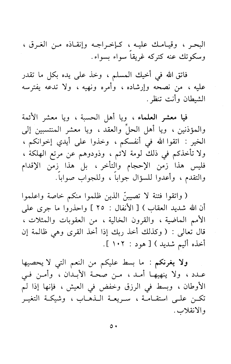 فيا معشر العلماء، ويا أهل الحسبة، ويا معشر الأئمة والمؤذنين، ويا أهل الحل والعقد، ويا معشر المنتسبين إلى الخير، اتقوا الله في أنفسكم، وخذوا على أيدي إخوانكم، ولا تأخذكم في ذلك لومة لائم، وذودوهم عن مرتع الهلكة، فليس هذا زمن الإحجام والتأخر، بل هذا زمن الإقدام والتقدم، وأعدوا للسؤال جوابا، وللجواب صوابا.
