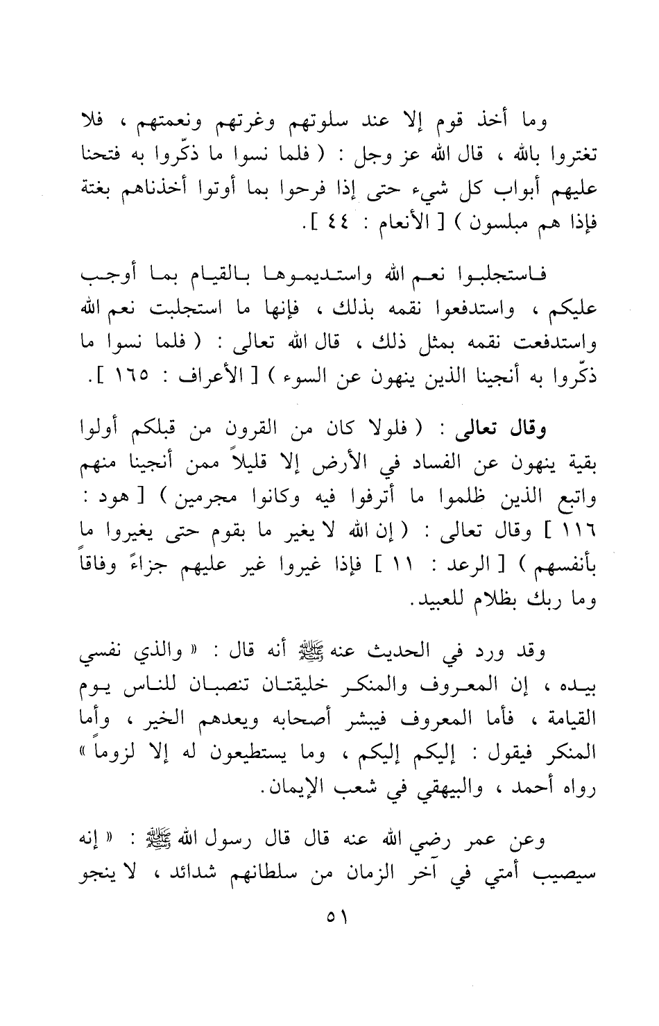 وقال تعالى: {فَلَوْلا كَانَ مِنَ الْقُرُونِ مِنْ قَبْلِكُمْ أُولُو بَقِيَّةٍ يَنْهَوْنَ عَنِ الْفَسَادِ فِي الْأَرْضِ إِلَّا قَلِيلاً مِمَّنْ أَنْجَيْنَا مِنْهُمْ وَاتَّبَعَ الَّذِينَ ظَلَمُوا مَا أُتْرِفُوا فِيهِ وَكَانُوا مُجْرِمِينَ} [سورة هود آية: 116] ، وقال تعالى: {إِنَّ اللَّهَ لا يُغَيِّرُ مَا بِقَوْمٍ حَتَّى يُغَيِّرُوا مَا بِأَنْفُسِهِمْ} [سورة الرعد آية: 11] ، فإذا غيروا غير عليهم جزاء وفاقا؛ وما ربك بظلام للعبيد.