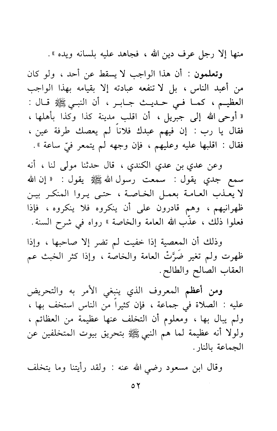 ومن أعظم المعروف الذي ينبغي الأمر به والتحريض عليه: الصلاة في جماعة؛ فإن كثيرا من الناس استخف بها، ولم يبال بها، ومعلوم أن التخلف عنها عظيمة من العظائم؛ ولولا أنه عظيمة لما هم النبي صلى الله عليه وسلم بتحريق بيوت المتخلفين عن الجماعة بالنار. وقال ابن مسعود رضي الله عنه: "ولقد رأيتنا وما يتخلف