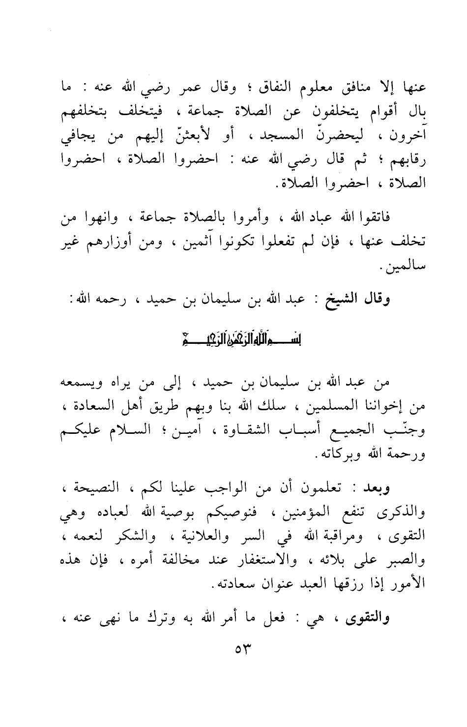من عبد الله بن سليمان بن حميد، إلى من يراه ويسمعه من إخواننا المسلمين، سلك الله بنا وبهم طريق أهل السعادة، وجنب الجميع أسباب الشقاوة، آمين. السلام عليكم ورحمة الله وبركاته.